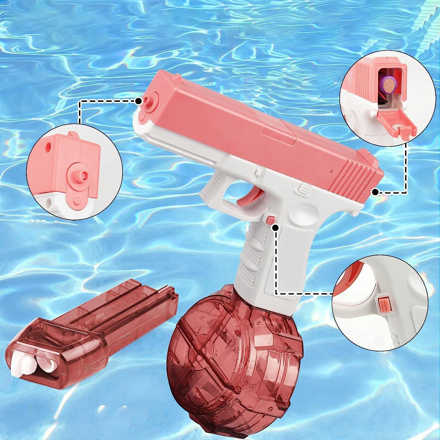 Електричний водний пістолет з однією кнопкою. Велика рожева ємність