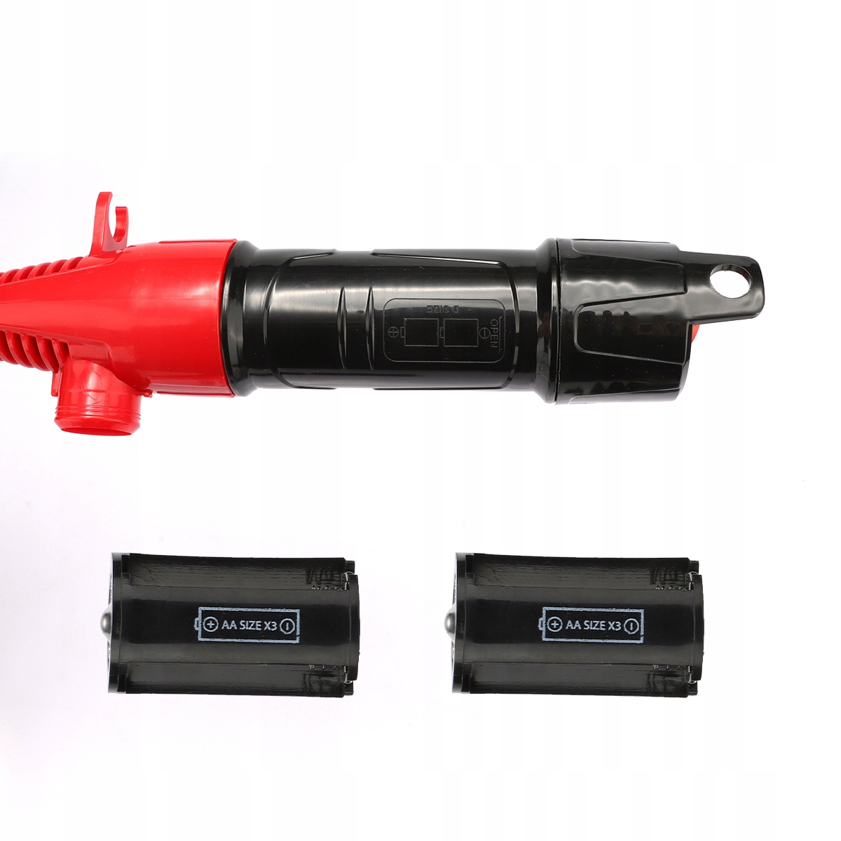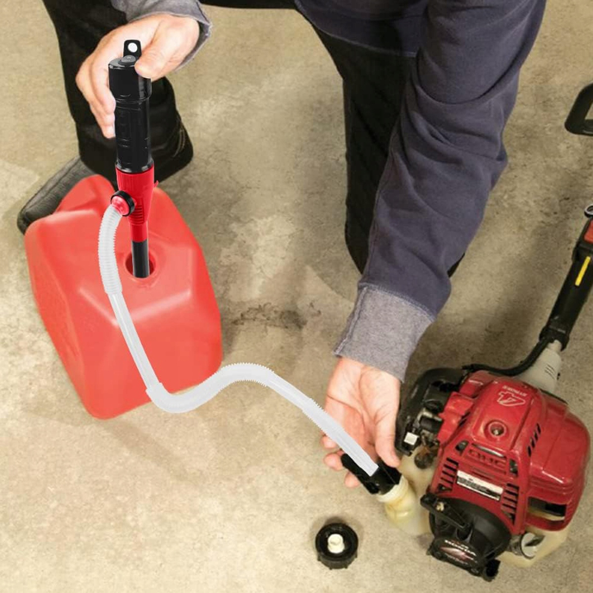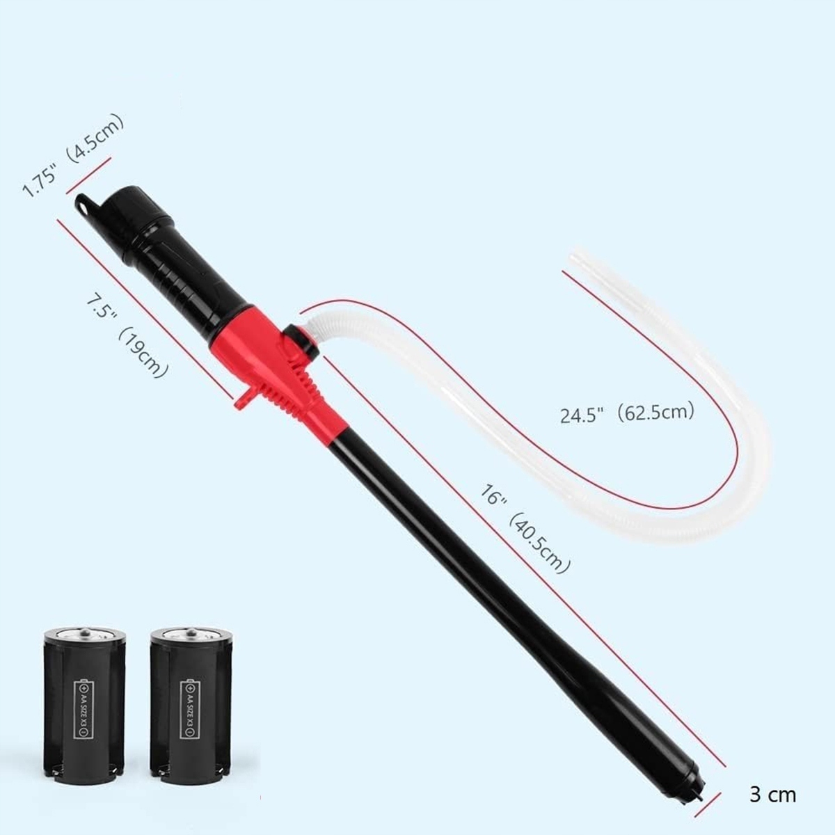 Матеріал: ABS; Колір: чорно-червоний; Розмір - деталі на фото. Діаметр всмоктуючої труби: прибл. 33 мм. Підходить для більшості паливних каністр (зверніть увагу, що діаметр каністри, з якої забирається рідина, має бути більше 33 мм). Довжина труби прибл. 40,5 см і довжиною шланга прибл. 62,5 см, підходить для паливних баків об’ємом від 3 до 5 галонів, бочок для масла, бочок тощо. Підходить для більшості надзвичайних ситуацій.