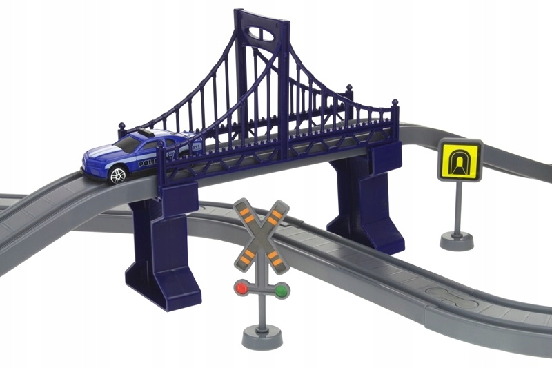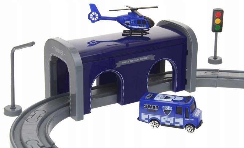 Поїзд із доріжками та аксесуарами ідеально підходить для захоплюючої та творчої гри. Набір складається з багатьох цікавих елементів, таких як електровоз з вагоном, 4 поліцейські машини, вертоліт і дорожні знаки. Кожен елемент стане додатковою атракцією під час конструювання та гри дитини. Живлення локомотива здійснюється від 2 батарейок типу ААА, які розміщені всередині локомотива. За допомогою магніту ви можете прикріпити до локомотива вагон, який ідеально підходить для перевезення поліцейських або в’язнів.