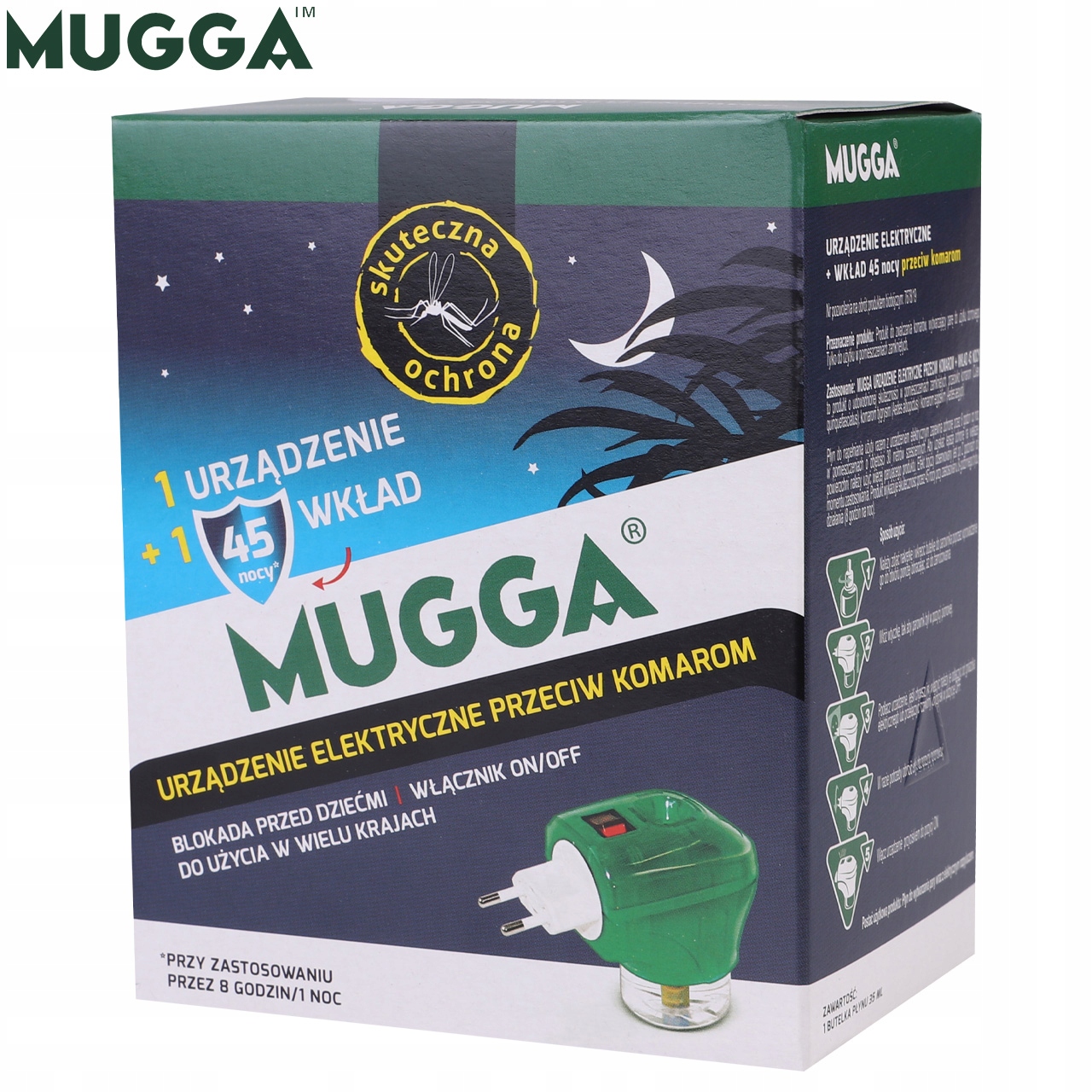 Одна вставка відлякувача комарів Mugga в розетку забезпечує захист протягом приблизно 45 ночей. Активні речовини, що містяться в рідині від комарів [Діюча речовина Пралетрин 1,2%], безпечні у використанні. Оптимальна робота досягається лише через 2 години після ввімкнення пристрою.