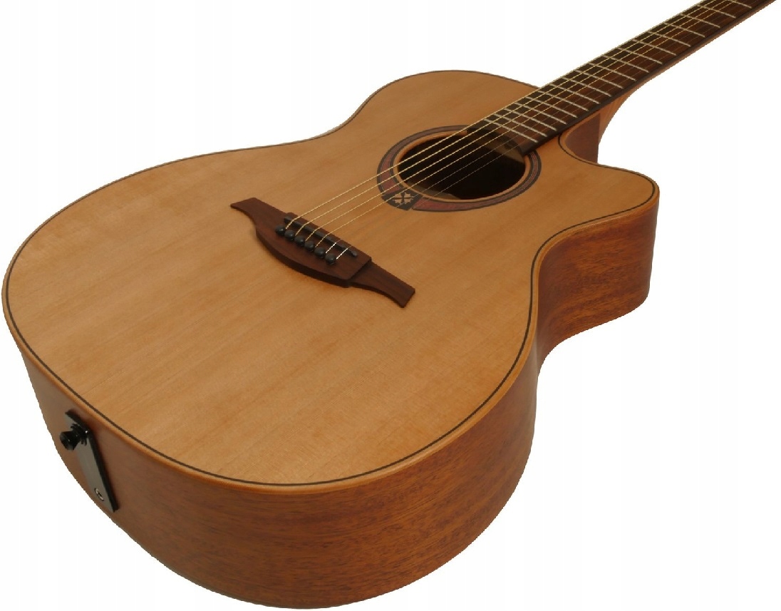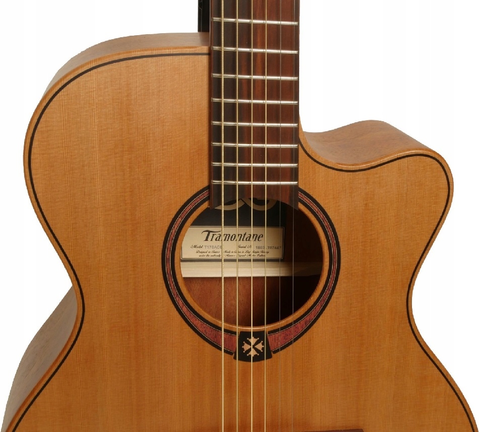 Ось остання модель електроакустичної гітари Tramontane Lag T170ACE гітара з звуковою коробкою Auditorium з вирізом. Верх виготовлений із твердого західного червоного кедра, бічні сторони та задня частина виготовлені з африканського червоного дерева (Cognac Brown) із сатиновою обробкою з відкритими порами. Гриф з африканського червоного дерева, гриф з коричневого дерева з 20 ладами. Чорні литі клавіші з передавальним числом 18:1 дозволяють швидко і точно налаштувати інструмент. Гітара оснащена активною електронікою Fishman Ink 3. Це новий стандарт серед попередніх підсилювачів для електроакустичних гітар, який вражає своєю елегантністю та вишуканим дизайном. Низький профіль потенціометрів не порушує естетики інструменту. Він має класичну електронну систему Fishman, вбудований тюнер Push to Tune з рідкокристалічним дисплеєм і 3-ступеневий еквалайзер звуку (низькі, середні, високі).