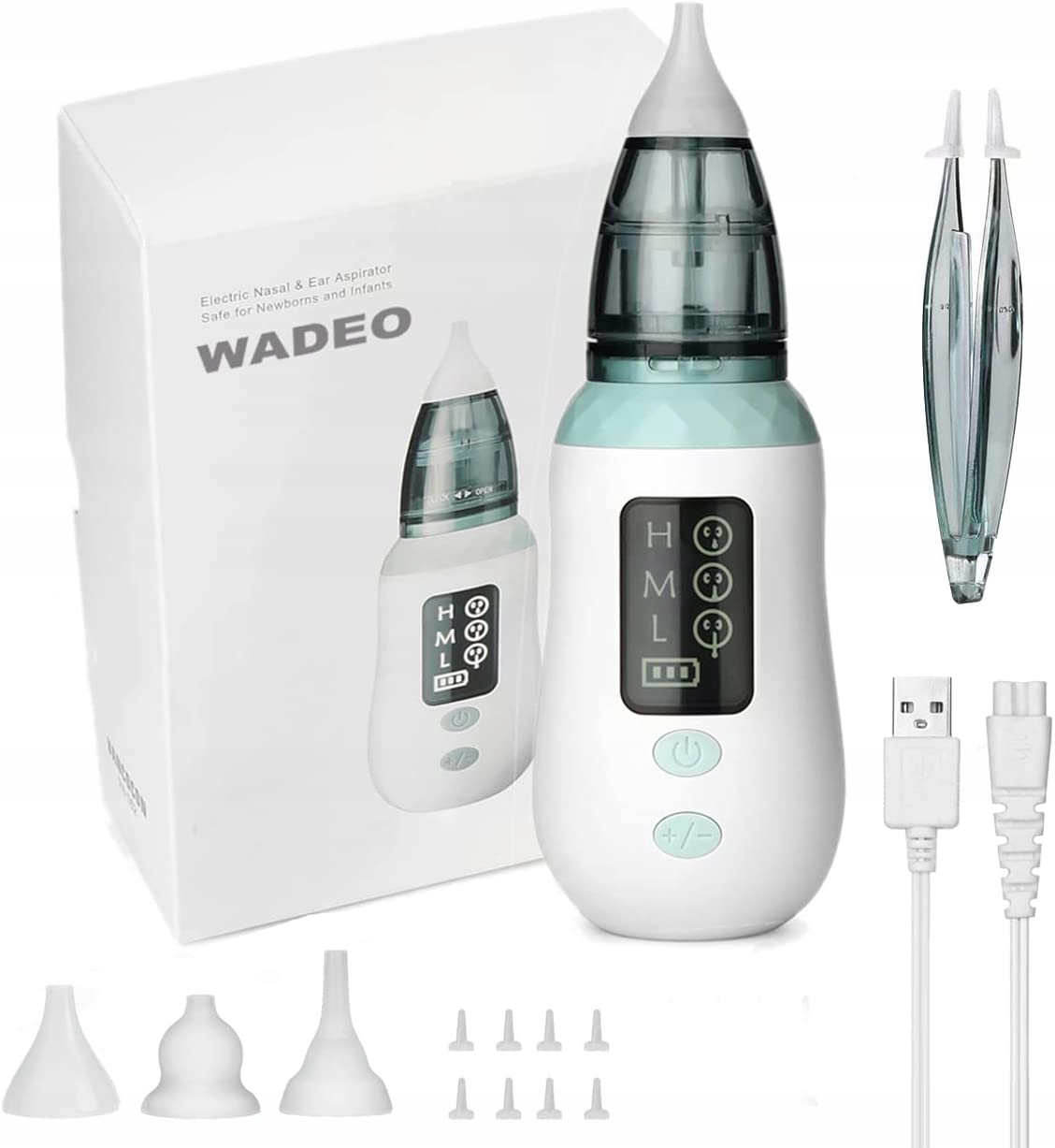 Дитячий назальний аспіратор WADEO Електричний назальний аспіратор для новонароджених, РК-екран із USB-зарядкою, 3 рівнями всмоктування, 3 розміри, силіконові наконечники, портативний назальний аспіратор, підходить для немовлят і малюків