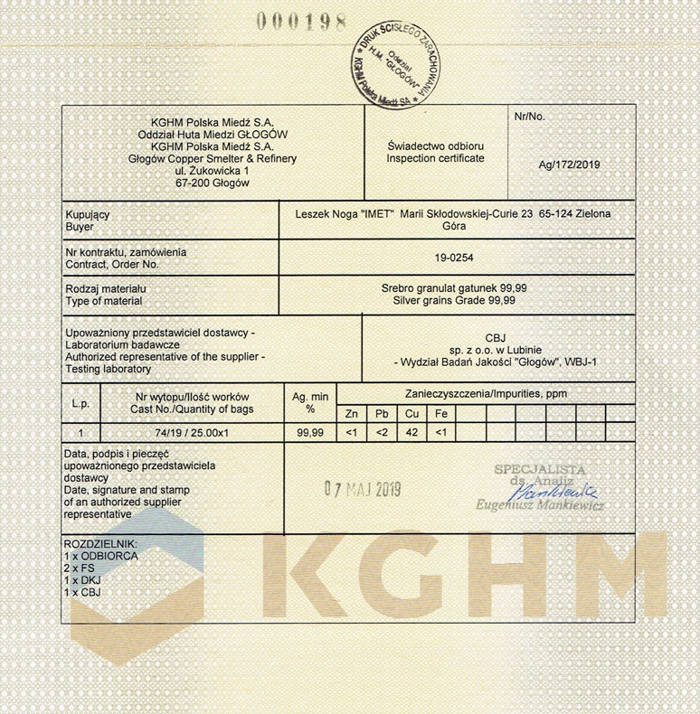 Якість срібла підтверджено уповноваженим представником постачальника - Науково-дослідна лабораторія CBJ, відділ перевірки якості "Głogów" WBJ-1