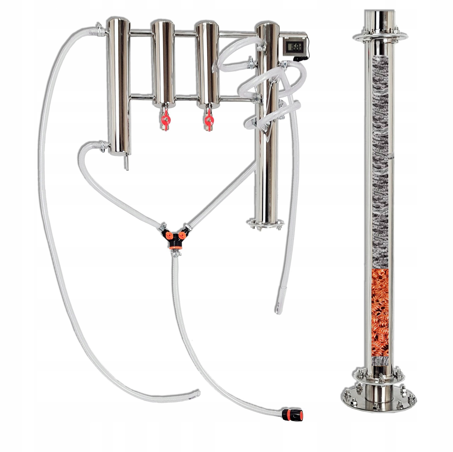 - Два відстійники об'ємом понад 1100 мл - b>кожен дефлегматор має приварені ніпелі та вкручені змінні кульові крани 3/8". Відстійники вловлюють різні фракції сивушних палив (небажаних сполук), що значно покращує якість кінцевий продукт