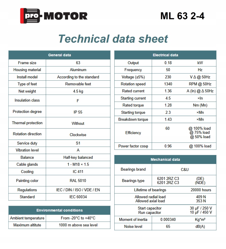 Електродвигун Однофазний Promotor ML 0,18кВт 1400 об/хв. 63B14