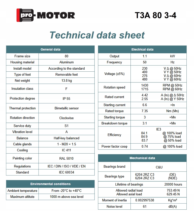 Електродвигун Promotor T3A 1.1кВт 1400 об/хв. 80 B5