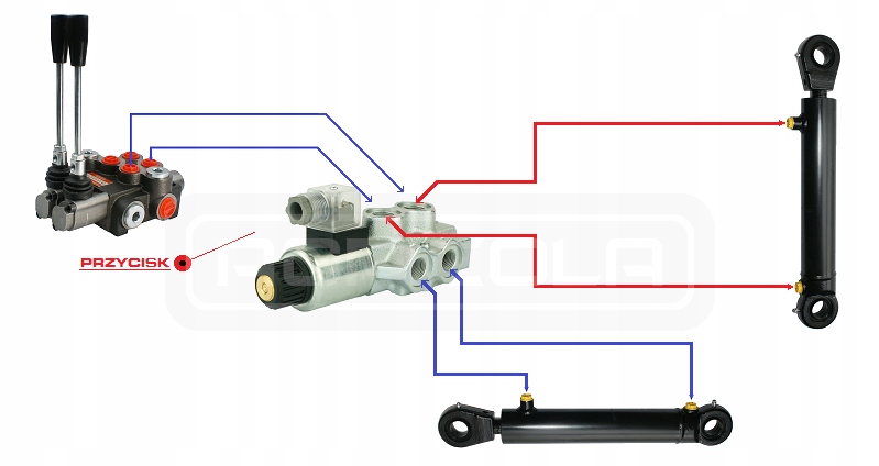 Електромагнітний клапан за допомогою електричного імпульсу (24 В) забезпечує перемикання між двома незалежно працюючими приводами подвійної дії. Це ідеальне рішення, коли у нас є гідравлічний розподільник, в якому вже використовуються всі наявні секції, і раптом виникає потреба керувати новим, додатковим приводом.