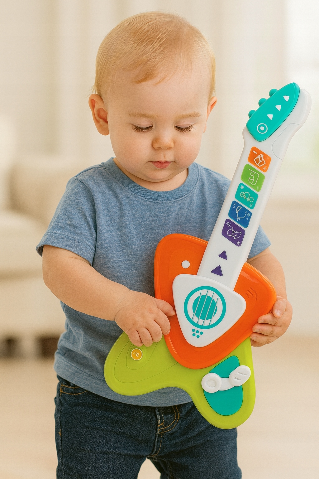 Сенсорна електрогітара — ідеальний варіант для дітей від вісімнадцяти місяців, які починають відкривати для себе світ звуків. Просто торкніться та грайте, без струн і кнопок!