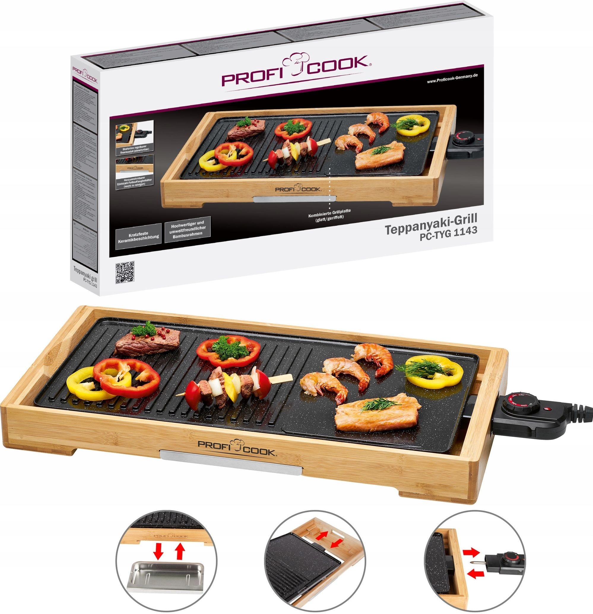 Гриль Teppanyaki PC-TYG пропонує комбіновану поверхню гриля, яка ідеально підходить як для смаження риби (завдяки гладкій поверхні), так і м’яса (завдяки дуже глибоким борозенкам, які створюють інтенсивний малюнок гриля). Завдяки цьому ви можете готувати різноманітні страви та насолоджуватися різноманітними текстурами та смаками.
