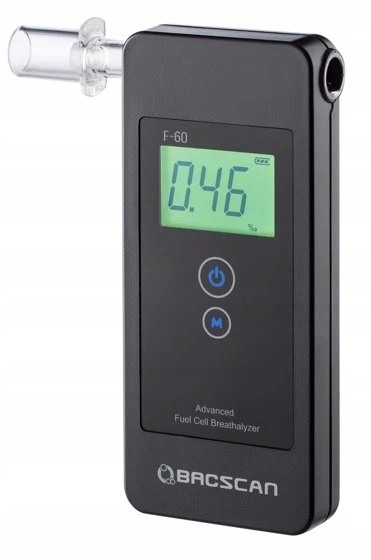 Електрохімічний алкотестер BACscan F-60 F60 — найновіший продукт із лінійки електрохімічних алкотестерів BACscan®. Він заснований на новому типі платинового датчика, який реагує тільки на етиловий спирт, завдяки чому точно визначає вміст алкоголю у взятій пробі. Він має широкий діапазон вимірювань від 0,00 до 5,00‰. Результати вимірювань відображаються з роздільністю до двох знаків після коми. Кріплення мундштука з підсвічуванням і яскравий РК-екран, що легко читається, дозволяють легко проводити вимірювання за слабкого освітлення. Корисним рішенням є сигналізація, яка спрацьовує при перевищенні допустимої концентрації алкоголю 0,20‰.
