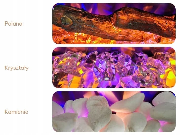 - Додаткова інформація: 3 кольори полум'я; 5 яскравість полум'я; 4 швидкості полум'я; 3 види камінів в комплекті: поліна, кристали та каміння