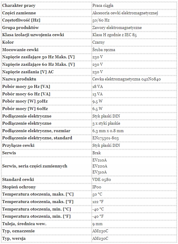 Danfoss Type AM230C Електромагнітна котушка (Кат. Адаптовано для 230 В змінного струму, він пропонує потужність та безперервну роботу в класі ізоляції H-I 7,5 Вт (змінного струму) / 9,5 Вт (постійного струму) у класі ізоляції H-I відповідно до IEC 85, оснащених плоскими контактами DIN (3 × 6,3 мм × 0,8 мм) відповідно до EN175301-803, гарантії легкої та безпечної збірки. Котушка кріпиться ручним гвинтом, має ступінь захисту IP00 і може працювати при температурі від -40 ° C до +50 ° С