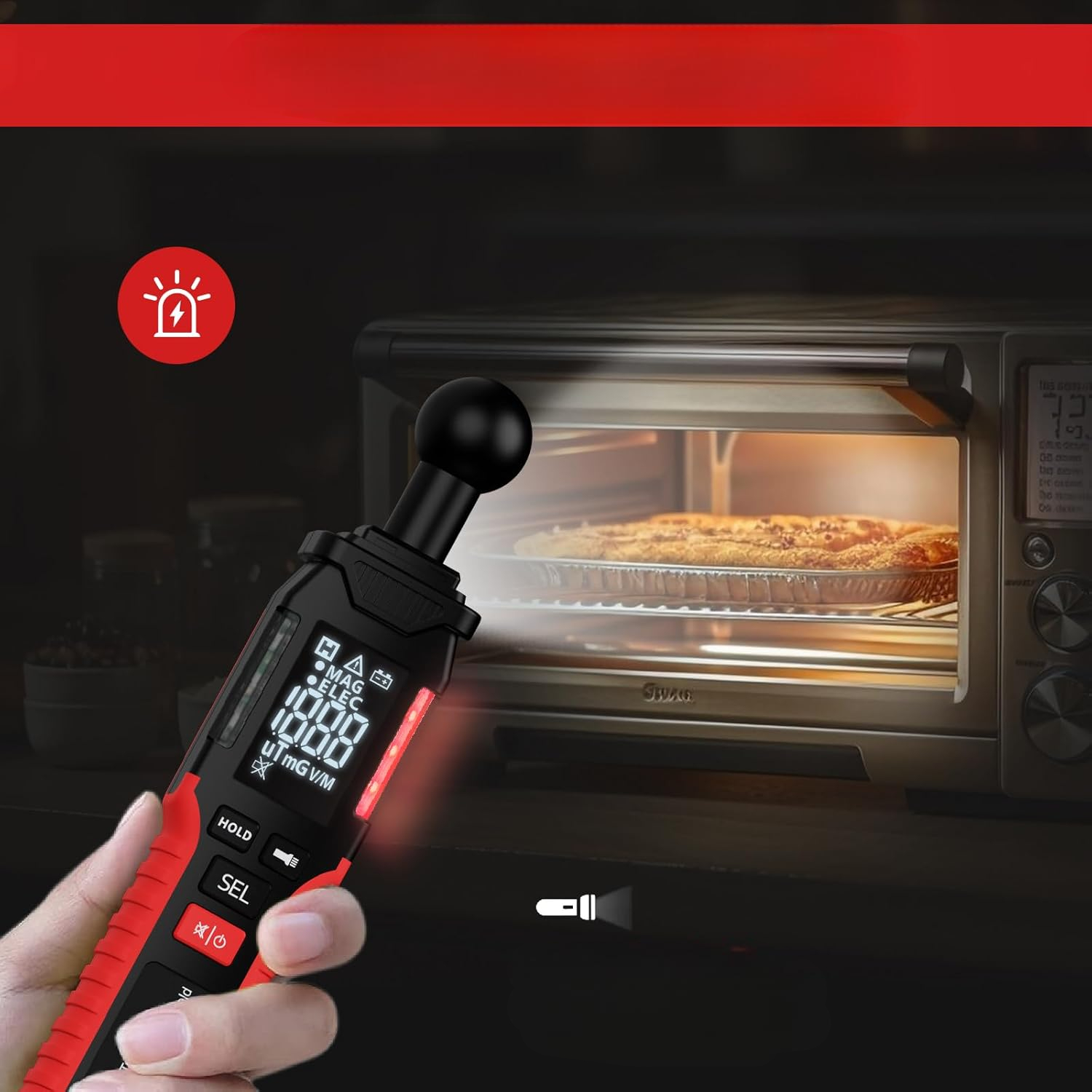 Коли виміряне значення перевищує рівень безпеки, встановлений за допомогою метра ЕРС та електромагнітною інтенсивністю (> 4,0 мг/0,4 мкт, електричне поле> 40 В. Зелений/червоний попереджувальний світло буде блимати з попереджувальним звуком.