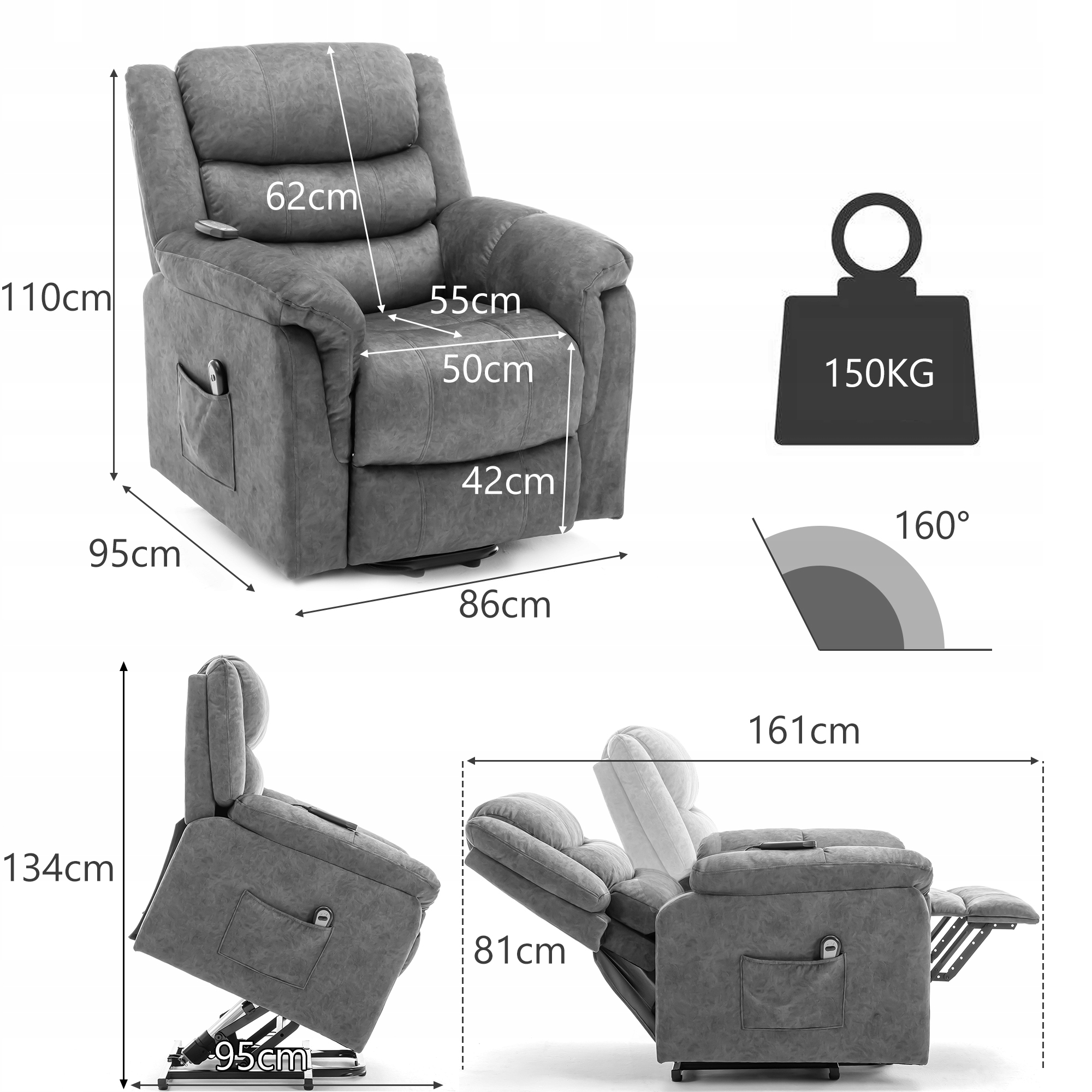 Крісло з електричним підйомником виготовлене з високоякісного матеріалу, має товсті подушки, набиті губками високої щільності, які підтримують сидіння в кріслі, але залишаються дуже зручними. М’яка тканина з гарною обробкою та дуже зручною прострочкою. Електричний стілець-реклайнер виготовлений з міцного деревно-металевого каркасу міцної та безпечної якості. Міцний, безпечний і перевірений на якість 25000-швидкісний двигун підйому й нахилу також дуже надійний.