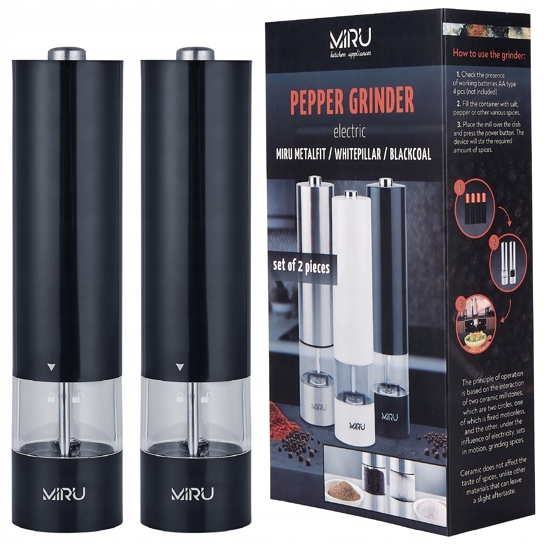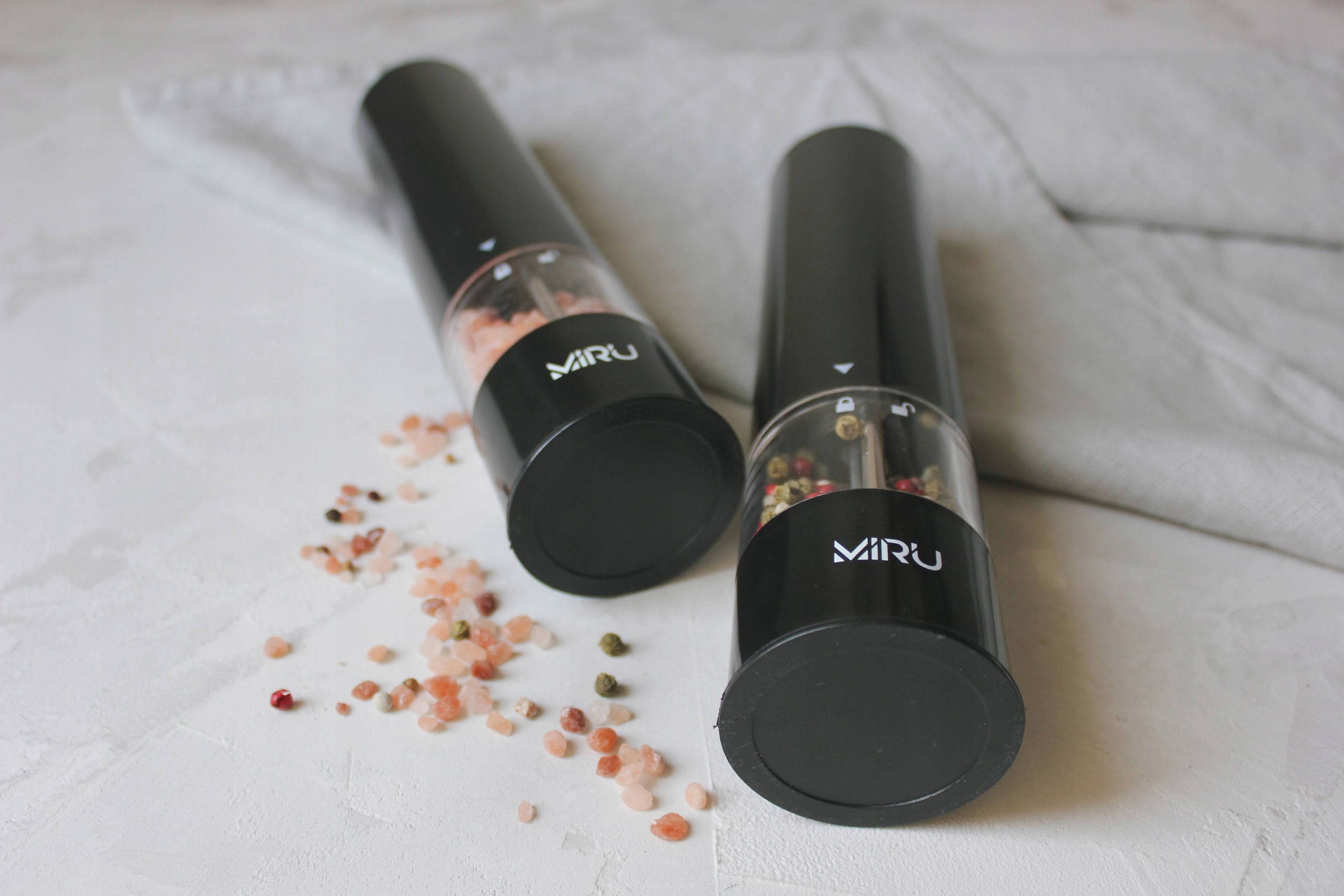 Електрична млинка для спецій - це не тільки зручний і потрібний інструмент на кухні, а й ефектне і стильне доповнення, яке збагатить інтер'єр вашої кухні. Поєднайте сучасний стиль і зручність із подрібнювачем солі та перцю MIRU.