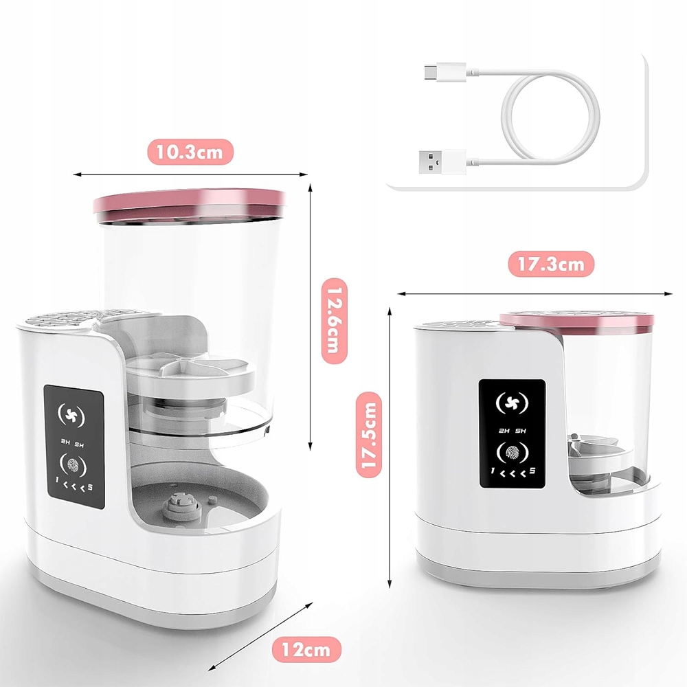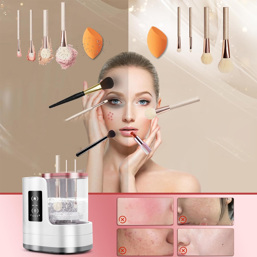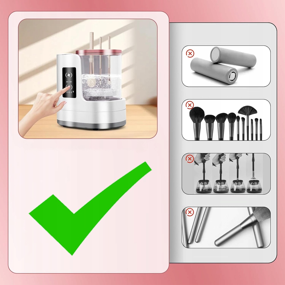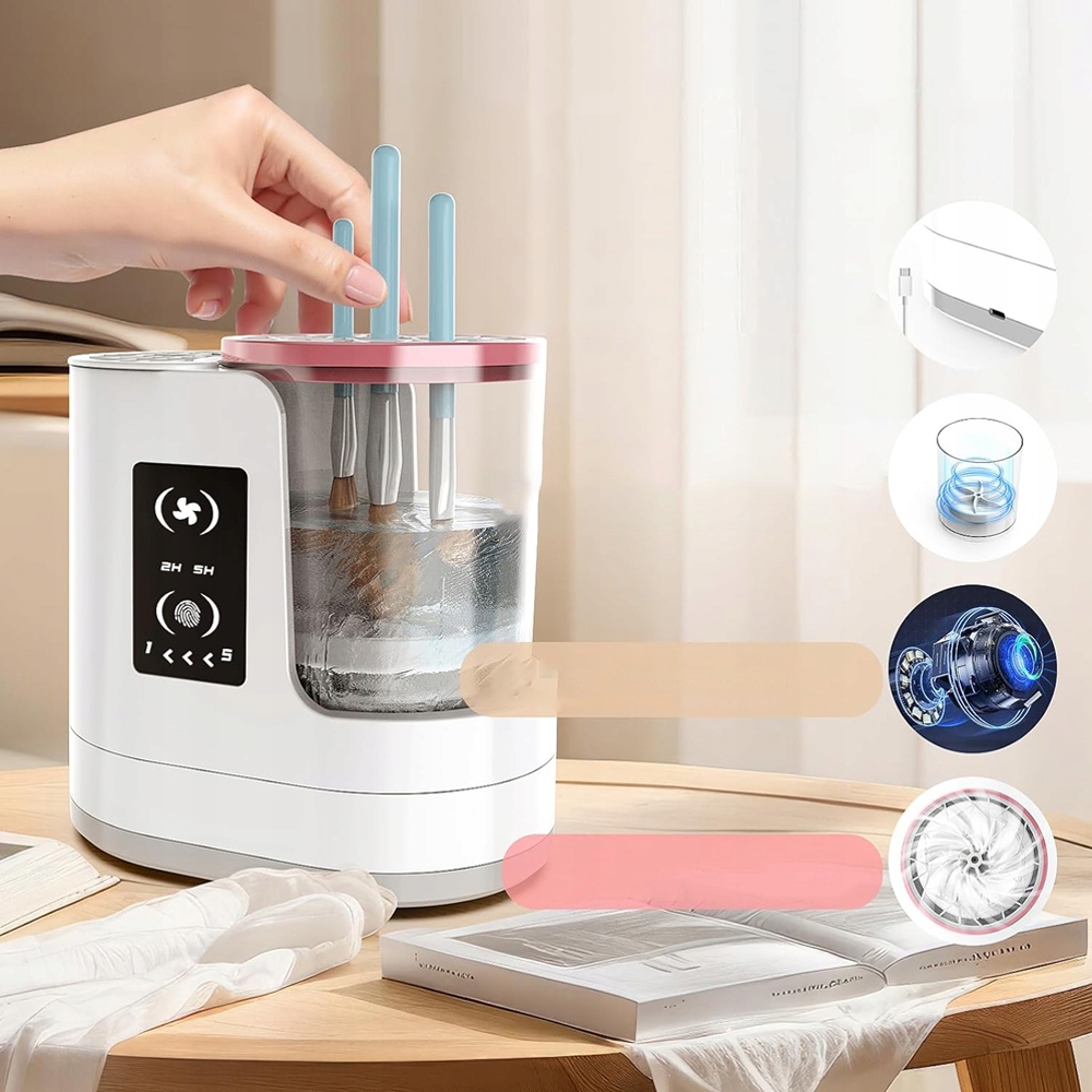 Два регульовані гумові затискачі надійно закріплять пензлі різного розміру - від тонких підводок до великих пензлів для пудри. Прозорий вологий контейнер запобігає розбризкуванню води. Просто підключіть пристрій до USB-порту (наприклад, на ноутбуці чи зарядному пристрої), додайте трохи води та рідини, вставте щітку та натисніть кнопку!