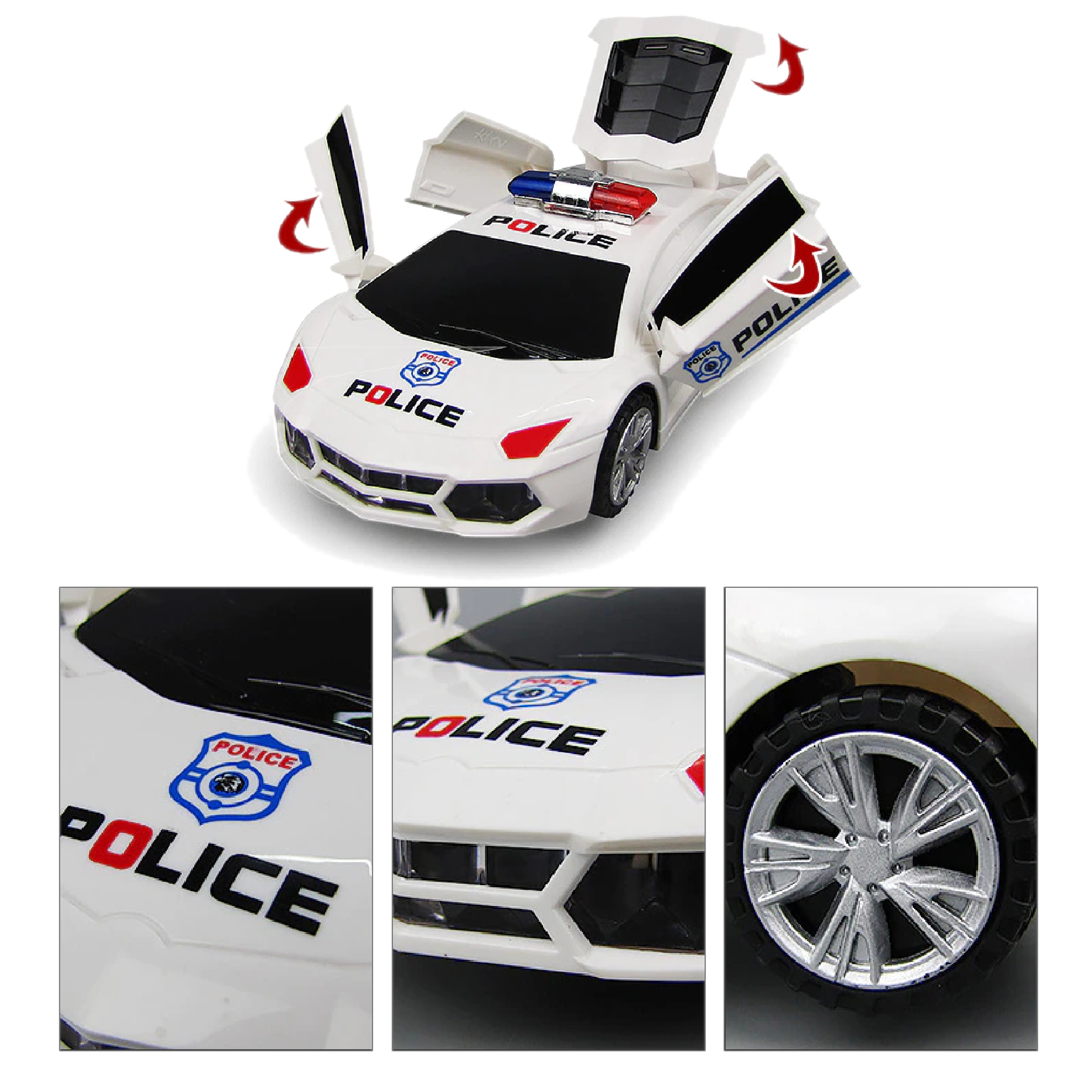 Іграшкова поліцейська машина - ідеальний подарунок для хлопчиків і дівчаток, особливо молодих поліцейські та поліцейські ентузіасти. Автомобіль оснащенийсвітловими та звуковими ефектами. Після запуску іграшковий автомобіль починає їздити і обертатися, при цьому відкриваються двері і багажник поліцейського автомобіля, оснащеного світлодіодним кульковим проектором, який починає світитися при запуску іграшки. Освітлення також надходить із передніх і бічних дверей.