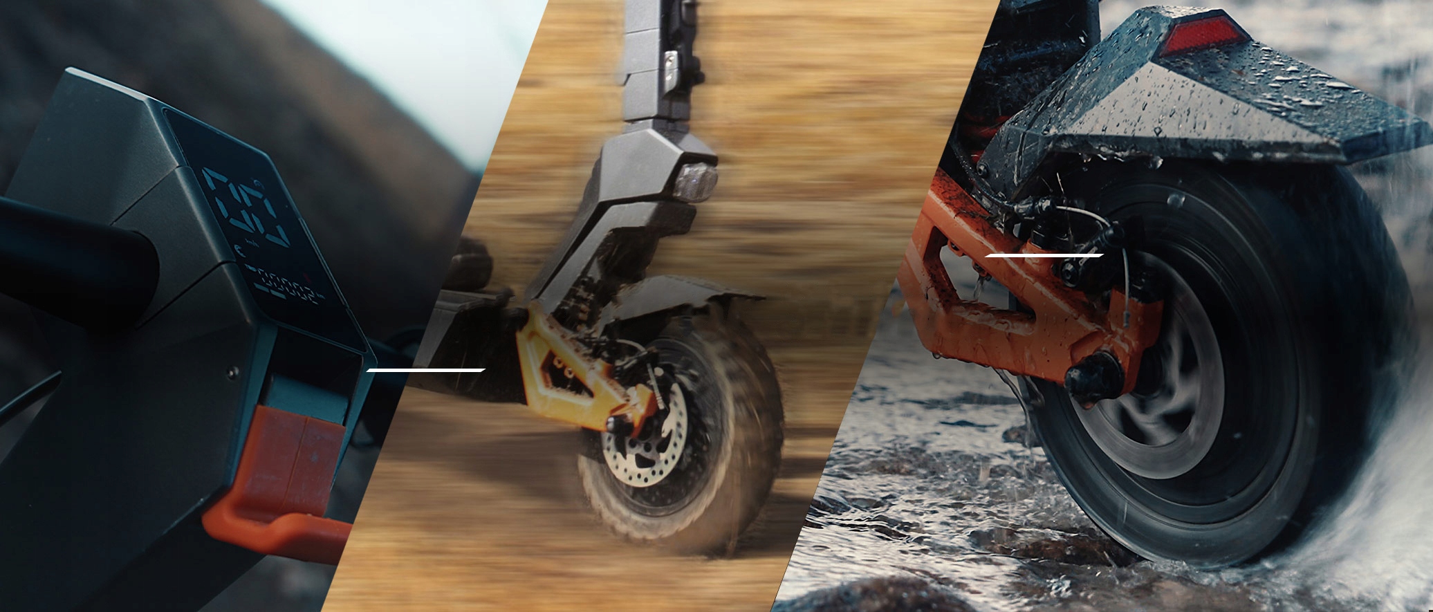 KuKirin G1 Pro використовує передні та задні дискові гальма з хорошою вентиляцією та розсіюванням тепла та покращеним гальмуванням; Відразу в умовах бездоріжжя полігон на високих швидкостях, легко закривається, відразу стартує.