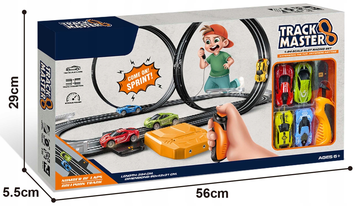 На гоночній трасі є 2 зручні контролери у вигляді джойстика. Автомобілі, що входять до набору, побудовані в масштабі 1:64.