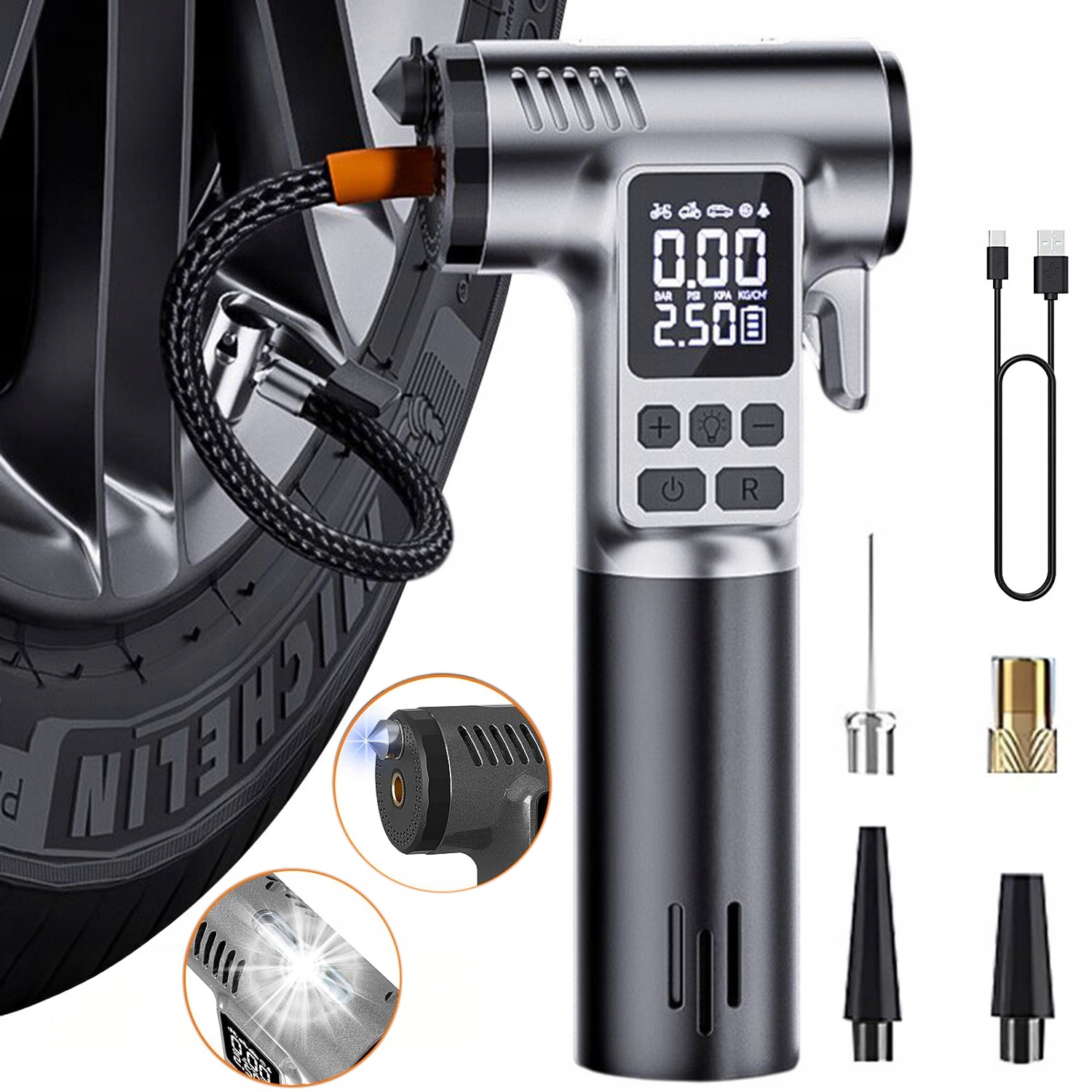 Електричний повітряний насос оснащений USB-кабелем для зарядки та 4 типами наконечників, які дозволяють накачувати автомобільні шини, мотоцикли, велосипеди, м’ячі та інші пристрої. Оновлена конструкція молотка високої жорсткості дозволяє легше розбивати вікна автомобіля, щоб втекти в екстреній ситуації. Вбудований ніж з нержавіючої сталі дозволяє швидко розрізати ремінь безпеки в критичні моменти.