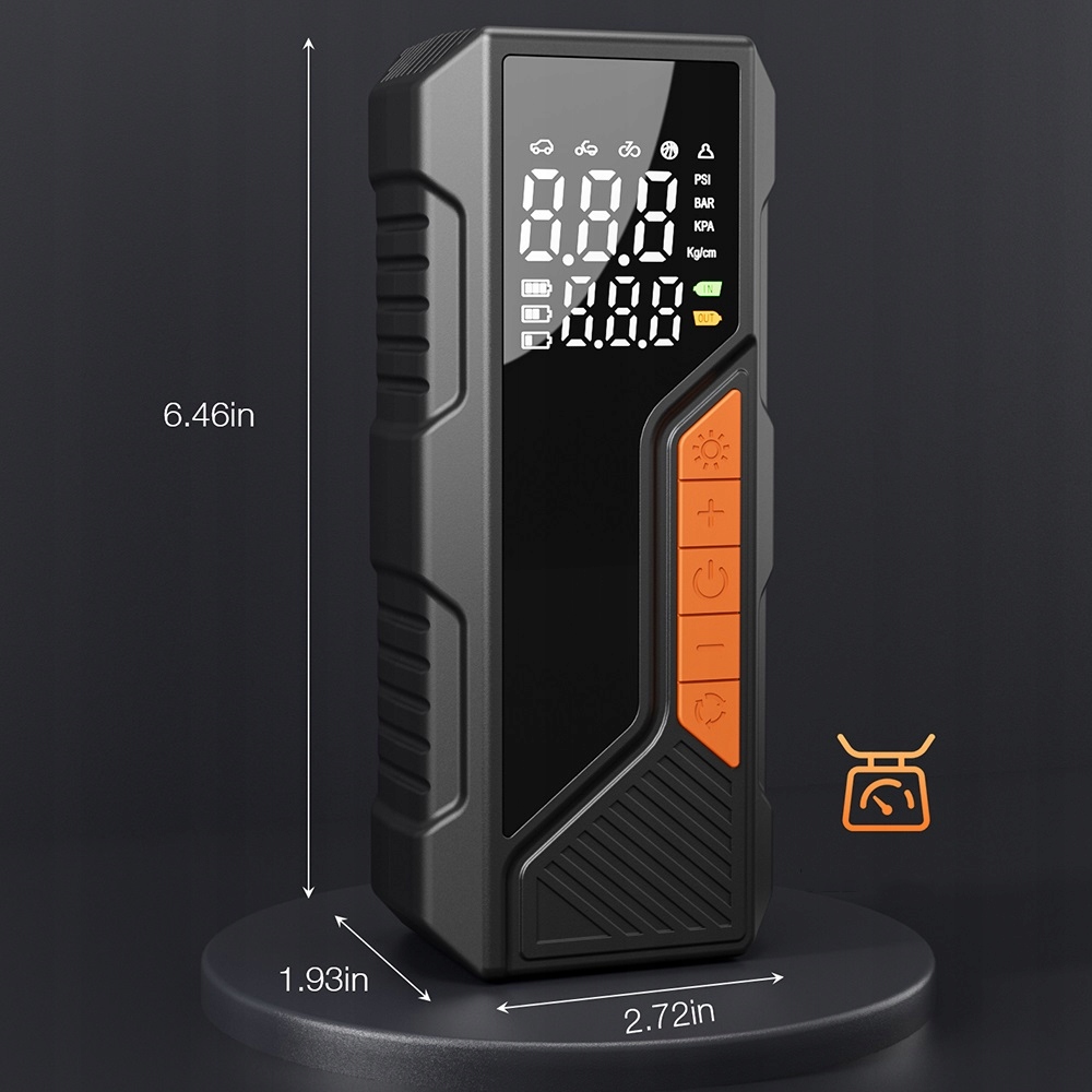 - Цей повітряний насос оснащено цифровим манометром, тож ви можете миттєво перевіряти значення тиску в реальному часі та встановлювати тиск на РК-дисплеях.