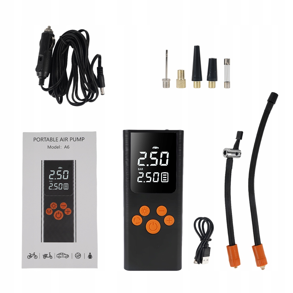 - Цей міні-компресор також постачається з 1 кульковою голкою, 2 повітряними форсунками та 1 надувною французькою насадкою, що робить його ідеальним інструментом для велосипедів, мотоциклів, автомобілів, м’ячів і плавальних кілець. Компактні розміри (16,2 x 6,7 x 4,9 см) і сумка для транспортування дозволяють легко транспортувати та брати з собою.