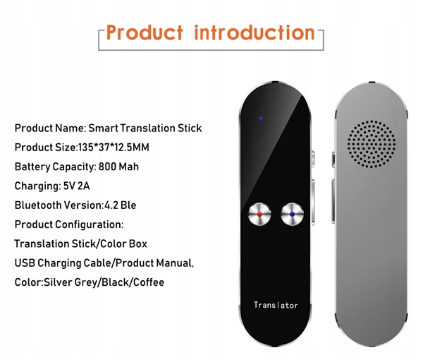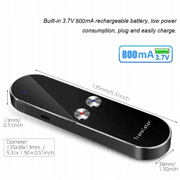Чутливий мікрофон і система активного шумозаглушення дозволяють точно розпізнавати та перекладати мову навіть у шумному середовищі. Вбудований великий акумулятор забезпечує багато годин роботи, і за потреби ви можете заряджати його за допомогою стандартного зарядного пристрою за допомогою кабелю Micro USB, який використовується, серед іншого, у смартфонах.