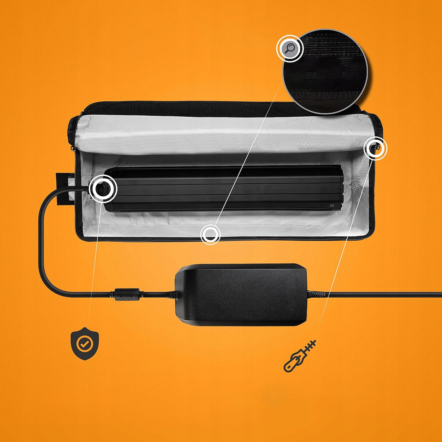 ідеально підходить для великих акумуляторів, сумка може вмістити до 2 акумуляторів (наприклад, серія Bosch PowerTube). Він має зручну ручку для легкої передачі та бічний отвір для безпечної та доступної зарядки.
