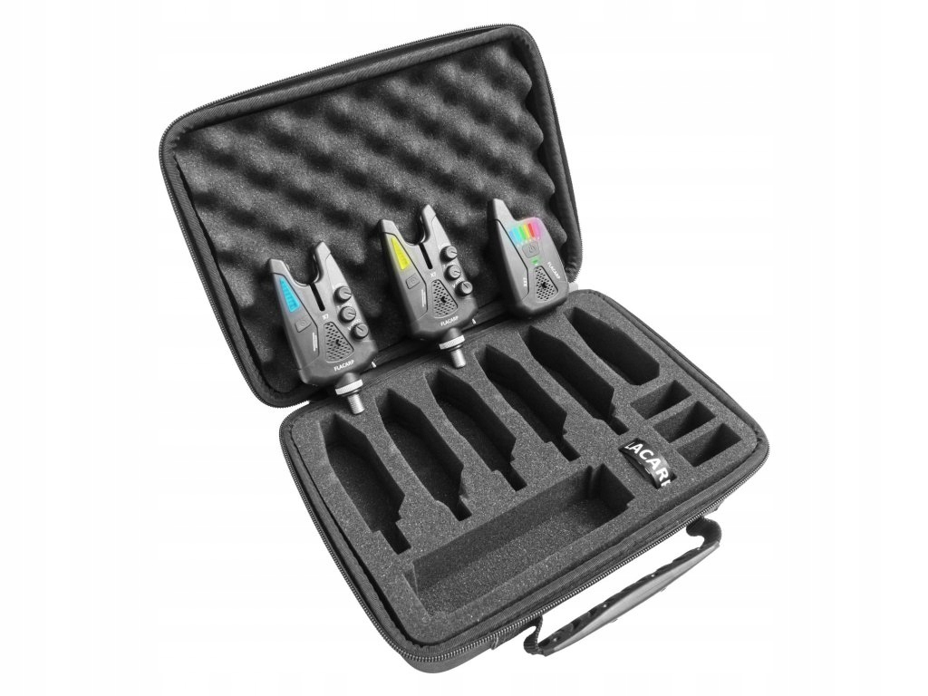 Сигнали Flacarp доставляються в міцній валізі в наборах від 2 до 4 сигнальних пристроїв + приймач. 15 см і має висоту 7,5 см. Гарантована сумісність дозволяє розширити набір. У наборі, повідку для підвіски приймача на шиї та інструкції. лінія від 1,5 мм в обох напрямках. Можливість регулювання довжини лінії риболовлі в широкому діапазоні, новий діапазон тонів від популярного глибокого "повзучого" до високих тонів, плавного контролю обсягу. Чітка оптична сигналізація з можливістю регулювання кольорів та яскравості світлодіодного RGB. Екстремальний механічний опір, що працює на стандартних акумуляторах AAA. з широким діапазоном налаштування руху