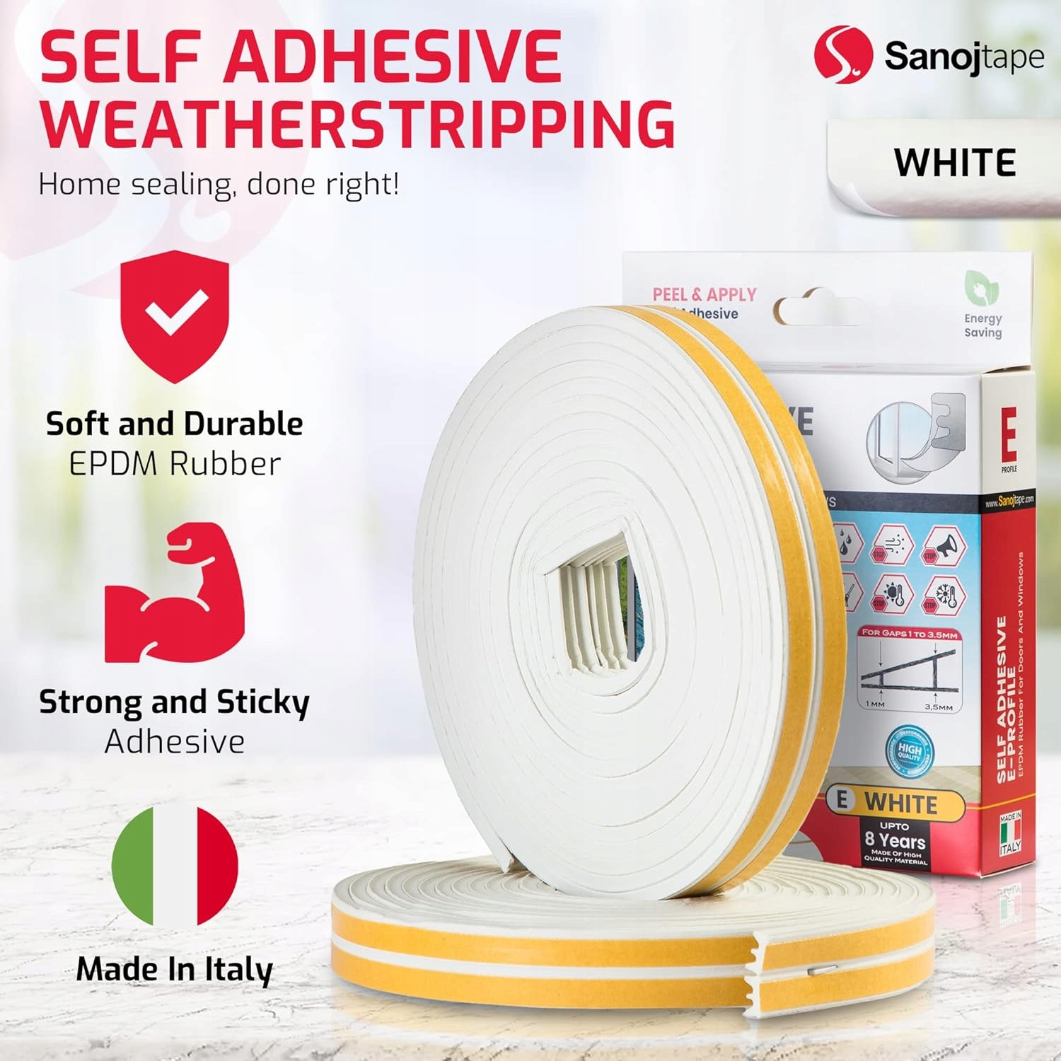 - Стрічкою Sanoj Sweden: Високоякісна ущільнювальна смуга перед проектом, що виробляється в Італії, до Sanojtape. Виготовлений з матеріалу EPDM, який є м'яким і довговічним. Ідеально підходить для герметизації, вітряних, пилозахисних вікон, дверей та інших місць.