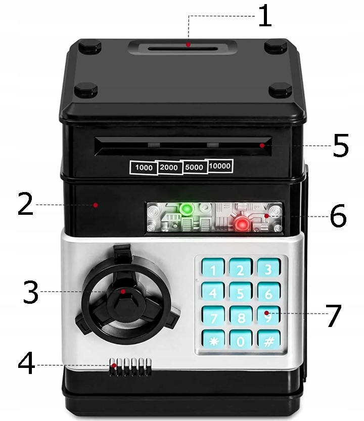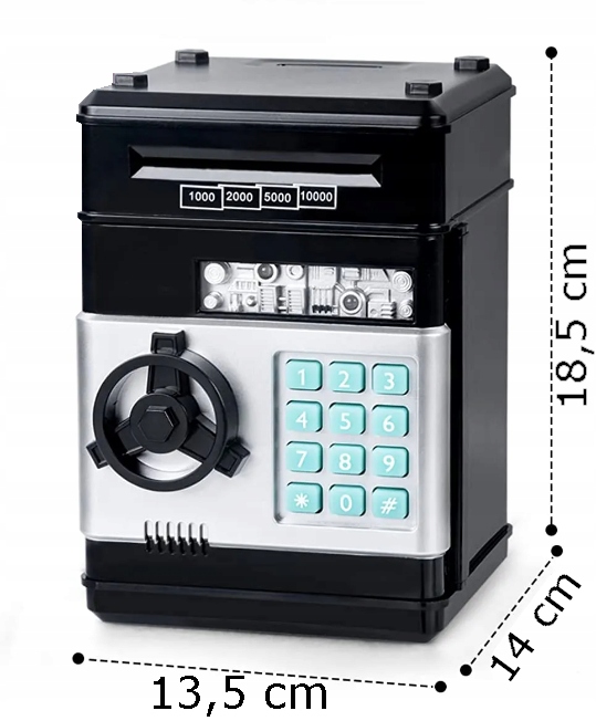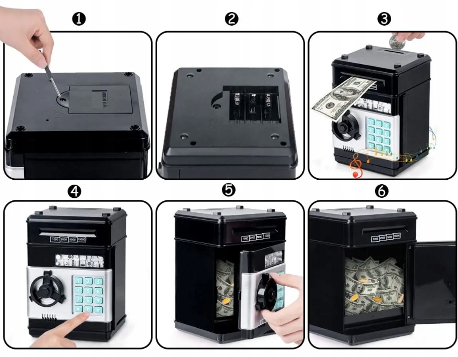 ✔️ Замикається PIN-кодом | ✔️Світлові елементи | ✔️Звукові елементи | ✔️Автоматично втягує банкноти | ✔️Живлення: 3 батарейки типу АА (не входять в комплект) |