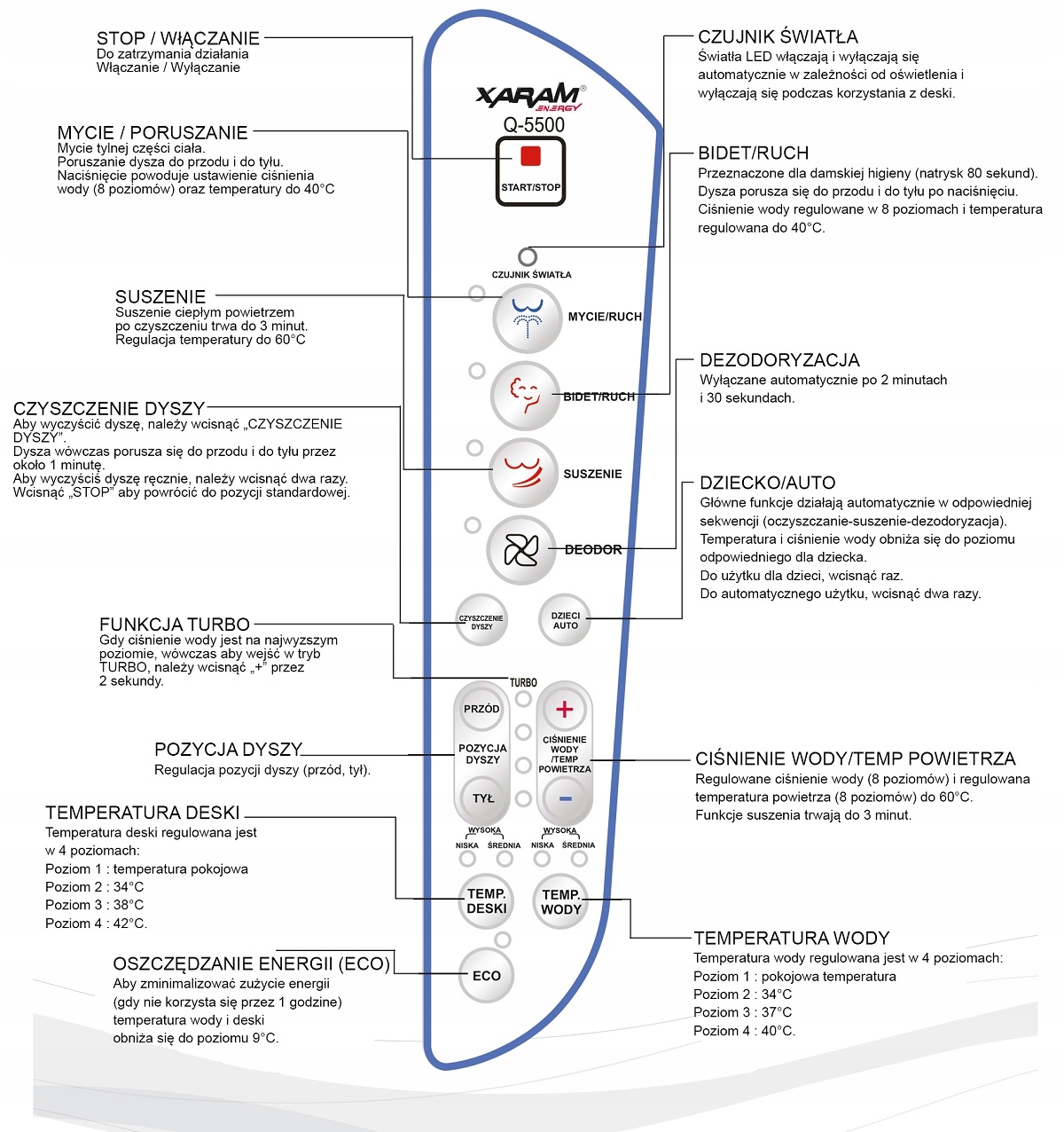 Електронне біде XARAM Energy Q-5500 має, серед іншого, такі функції як: прання для жінок і чоловіків, підігрів сидіння, рухливі та регульовані форсунки, аерація води, підігрів води (в баку), автоматичне очищення форсунок, регулювання температури води, регулювання положення форсунок, регулювання тиску води, функція енергозбереження, прання автоматична функція, осушення теплим повітрям, датчик тиску, освітлення, діагностика проблем, функція ароматизації запаху, функція дезодорації, антибактеріальний корпус і сидіння, що повільно закривається.
