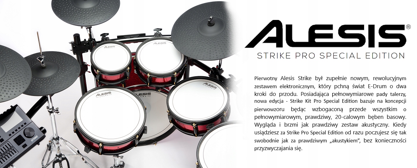 Оригінальний Alesis Strike був абсолютно новим, революційним електронним набором, який зробив би світ E-Drum на два кроки вперед. Завдяки збільшеній конфігурації, нове видання - Strike Kit Pro Special Edition засноване на концепції оригіналу, збагачене головним чином повнорозмірним, справжнім, 20-дюймовим бас-барабаном, який реагує і звучить так само, як звичайний ударний барабан! Завдяки цьому все виглядає і звучить як справжній набір. Коли ви сідаєте за Strike Pro Special Edition, ви відразу відчуєте себе комфортно, як за справжньою «акустикою», не звикаючи до неї.