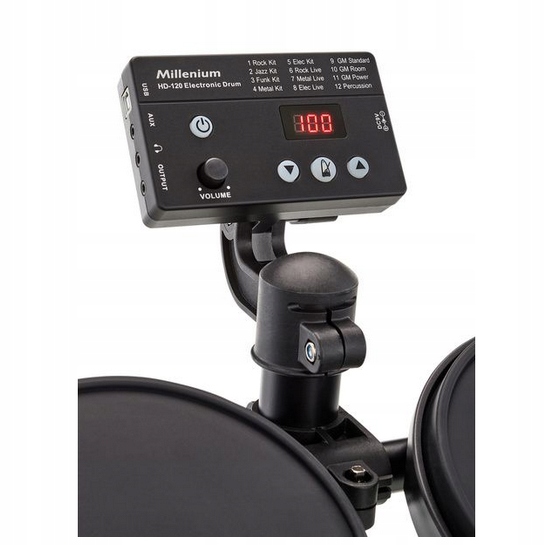 Millenium HD-120 E-Drum Set — це повна електронна барабанна установка, призначена для початківців барабанщиків і дітей. Завдяки своїм компактним розмірам (100 × 60 см) він ідеально підходить для невеликих приміщень, а багате оснащення дозволяє почати вчитися грі відразу після розпакування. Набір містить 12 звукових наборів (Drumkits), метроном в діапазоні 40–240 bpm і зручні роз'єми: USB-MIDI, Aux In 3,5 мм, навушники і лінійний вихід. У набір входить: малий барабан 07", томи 3 07, тарілки 3 09", контролер для барабанів, хай-хет з педаллю, стійка для барабанів, табурет, навушники, палиці, тримач для палиць, блок живлення та кабелі. Це ідеальний вибір для людей, які хочуть почати свою пригоду з гри на барабанах вдома, без шуму акустичних барабанів.