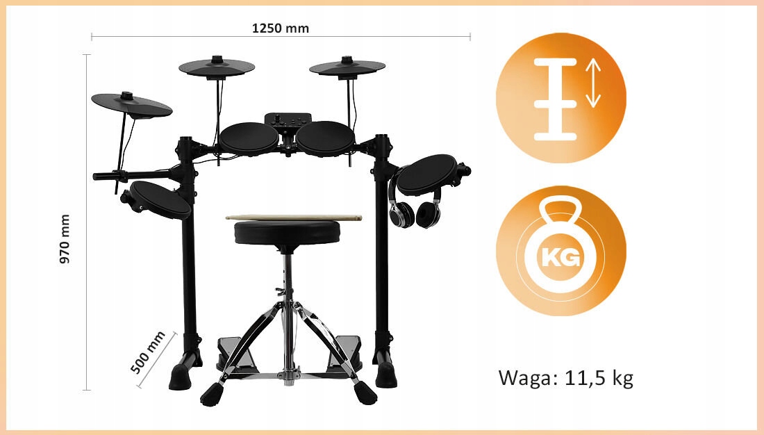 Набір включає: звуковий модуль, педаль баса, педаль Hi-Hat, начальник колодки, 2x Pad Tom, котел котла, тарілки: Hi-Hat, Crash, Ride. Комплексний набір має розміри 125 х 97 х 50 см і важить близько 11,5 кг.