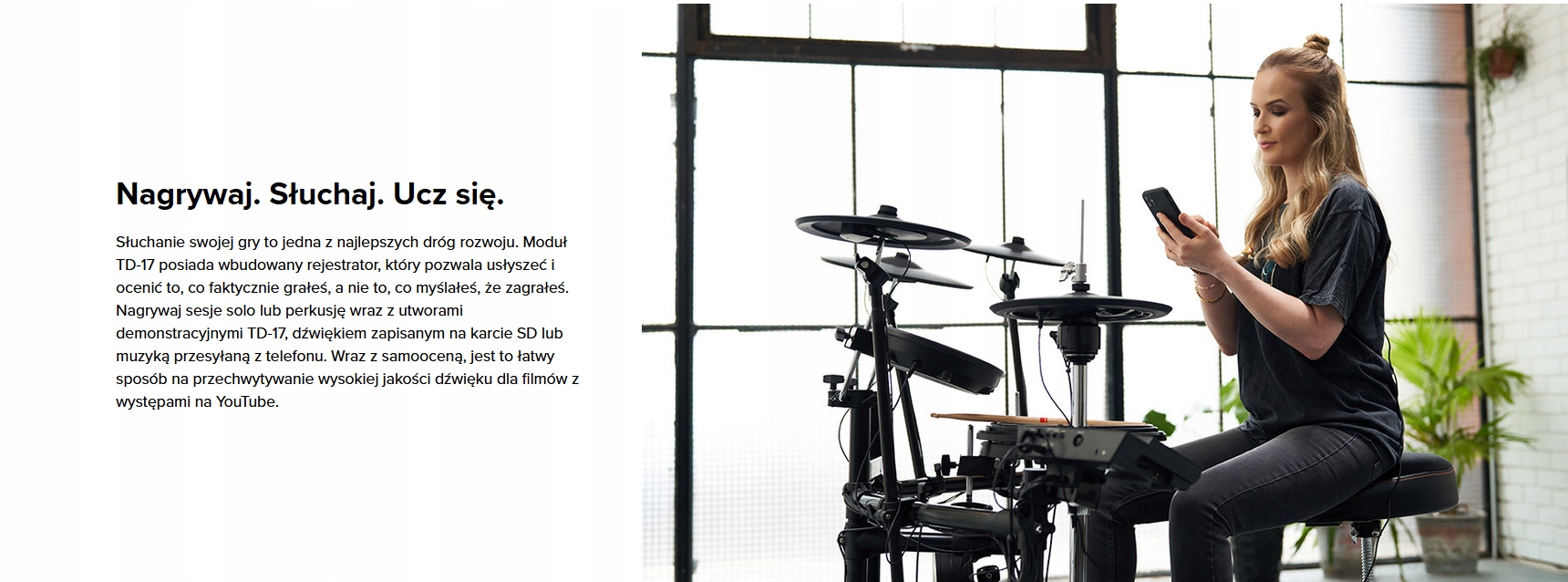 Якщо ви серйозно ставитесь до гри на барабанах, інструмент, який ви використовуєте, має відповідати вашим амбіціям. Нова модель TD17 допоможе вам швидко пройти наступні етапи навчання або вдосконалення вже хороших навичок вдома, навіть якщо ви професійний барабанщик. Наші найкращі технології, які поєднують постійно вдосконалювані конструкції педів і контролерів з новітньою електронікою, ефективно зводять до нуля різницю між відчуттями від гри на акустичних і електронних інструментах. Досі ці відчуття були доступні лише клієнтам, які обирали наші найдорожчі інструменти. Рухи, які ви можете виконувати за майданчиком, не повинні бути жодним чином обмежені. Відтепер вам не потрібно змінювати свою техніку на гру на електронних барабанах. З новою серією TD17 ми доводимо, що ці інструменти стають повноцінною заміною традиційним акустичним барабанам. Для постійної мотивації ваших тренувань модуль оснащено найкращими тренувальними функціями та можливістю записувати ваш прогрес і грати. Щоб ви завжди відчували мотивацію до вправ і могли спостерігати за їхнім ефектом і власним прогресом.