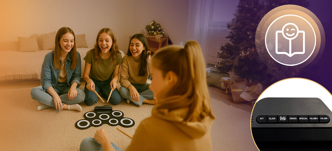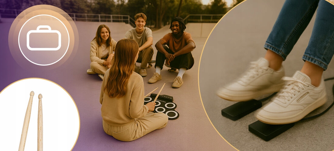 Завдяки вводу 3,5 мм Aux Jack 3,5 -мм виводу навушників гнізда, ви можете легко підключити Rolldrum до зовнішніх пристроїв - смартфон, комп'ютер або динамік. Ви можете грати з улюбленими піснями, записувати свої ритми або використовувати набір як інтерактивний навчальний інструмент. Інтуїтивний контроль дозволяє зосередитись на музиці без зайвих налаштувань.