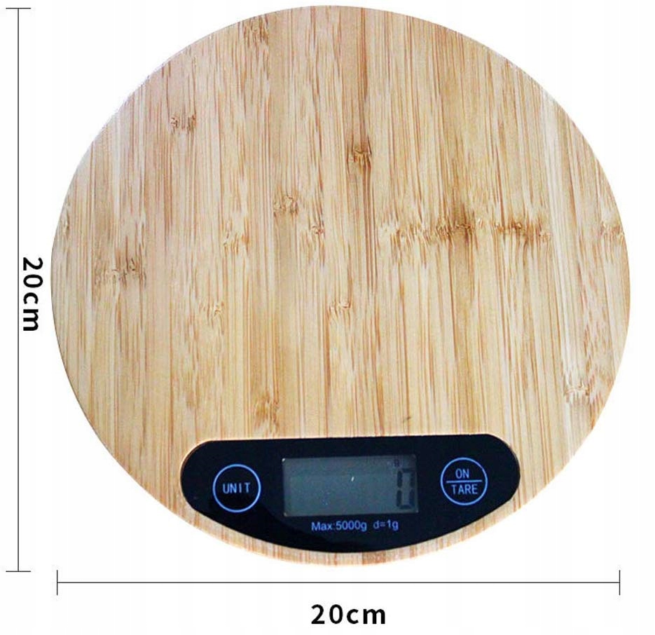 Круглі бамбукові електронні кухонні ваги з РК-дисплеєм до 5 кг з функцією тари.