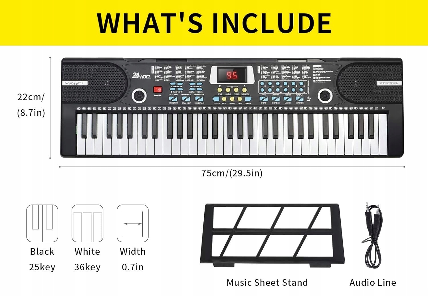 Клавіатура 24HOCL 61 Клавіша постачається з усім, що потрібно безпосередньо з коробки, включаючи мікрофон, стенд для прокату музики, аудіо-кордон та живлення. Фортепіано