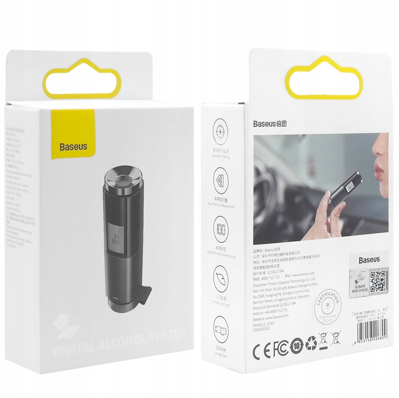 Маленький цифровий алкотестер від Baseus для вимірювання концентрації алкоголю у видихуваному повітрі. Удосконалений електрохімічний датчик вимірює вміст алкоголю, і результат відображається протягом 10 секунд.