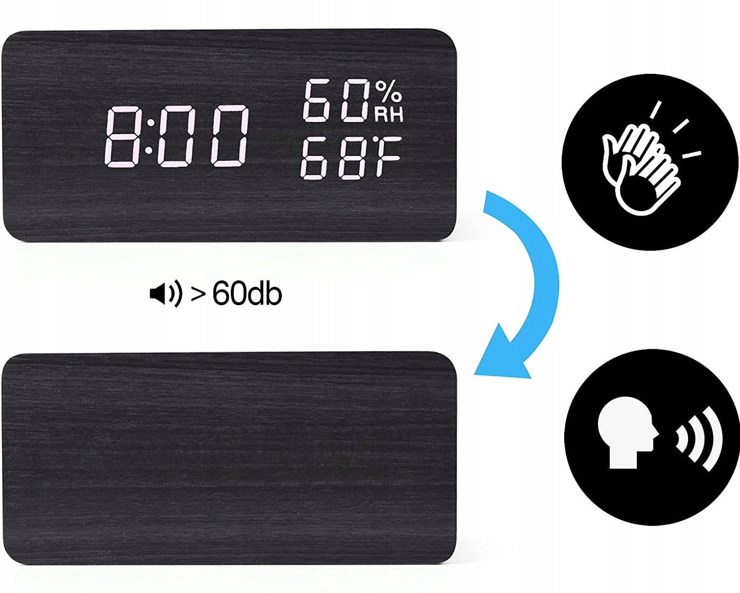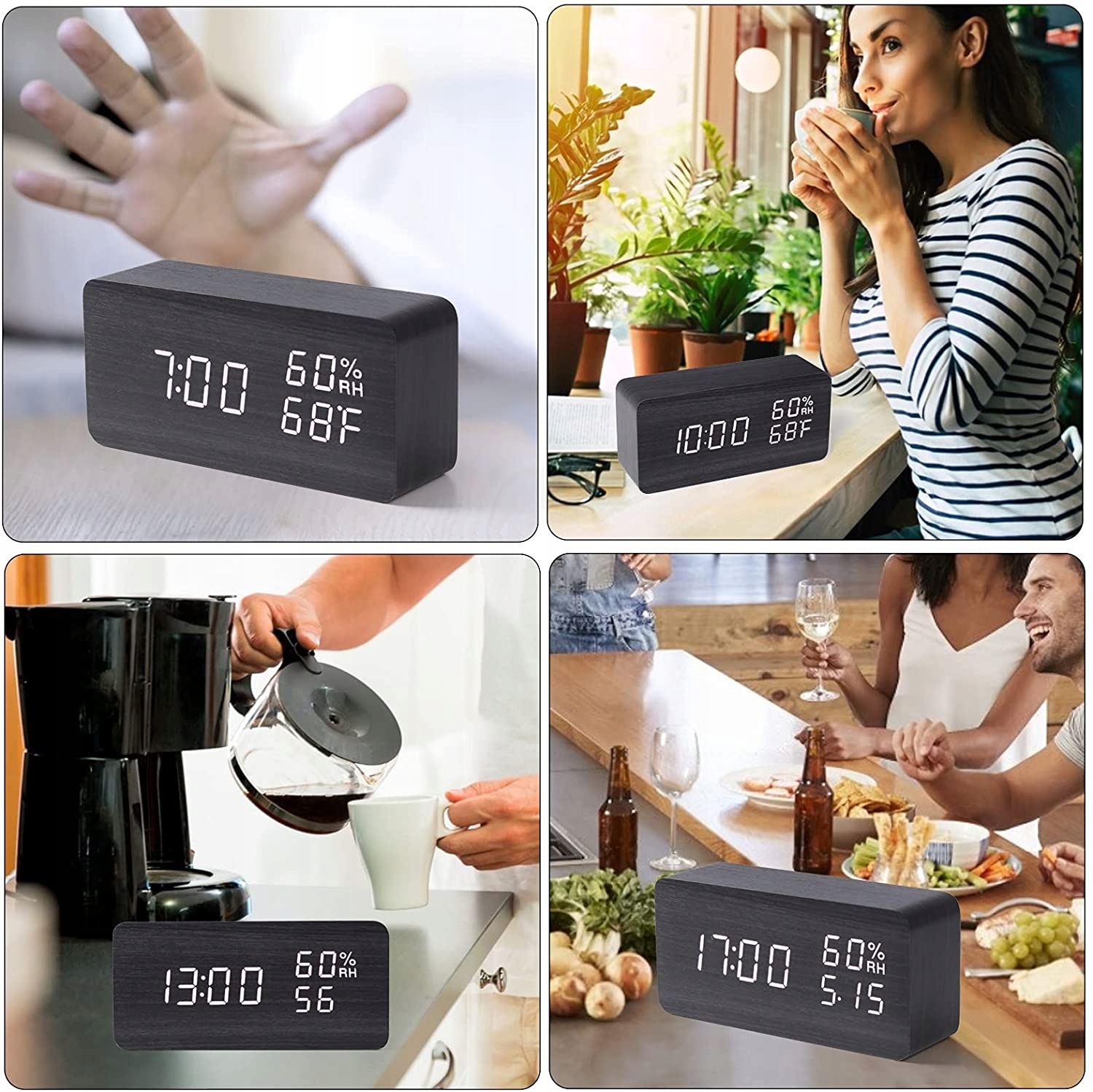 Сучасний та естетичний цифровий годинник з імітацією дерева стане ідеальним доповненням до спальні, офісу чи вітальні. Його цифри з підсвічуванням добре видно вдень і вночі, функція будильника добре працює щодня, а елегантний дисплей чудово виглядає в будь-якому інтер'єрі. Також прилад має функцію календаря та вимірює температуру та вологість повітря.