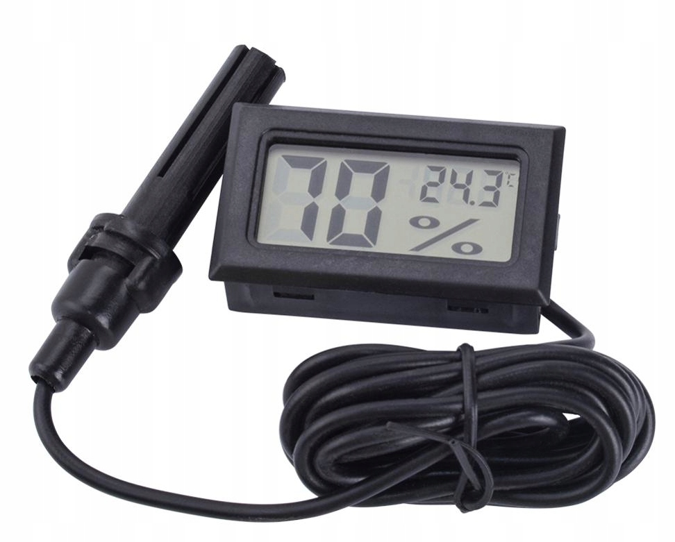 Електронний гігрометр з термометром з великим РК -дисплеєм та зондом на довгому кабелі.