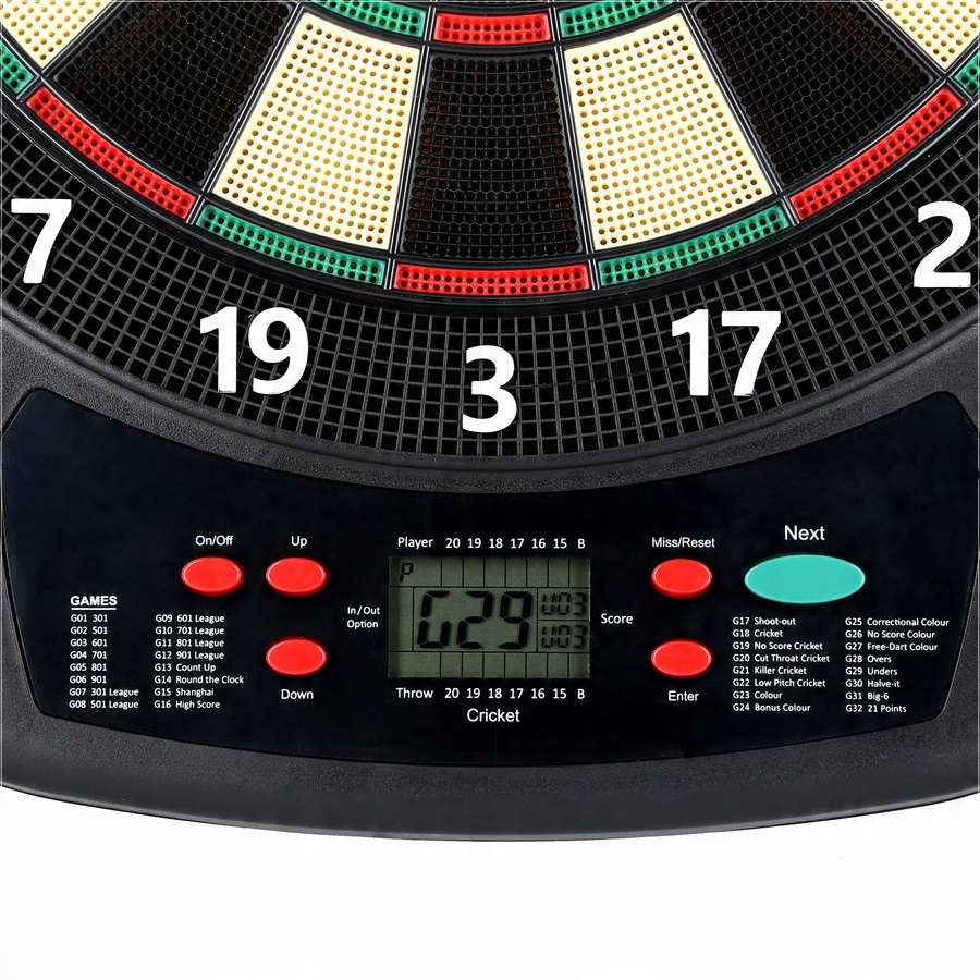 Змагання для кількох гравців і режими гри: Ви запросили своїх друзів на турнір з дартсу? Наша дошка підтримує до восьми гравців одночасно, що дозволяє кожному учаснику повністю залучитися в гру. Крім того, TDE03 має аж 32 різні ігрові режими, які, безсумнівно, забезпечать нові випробування та незабутню розвагу.