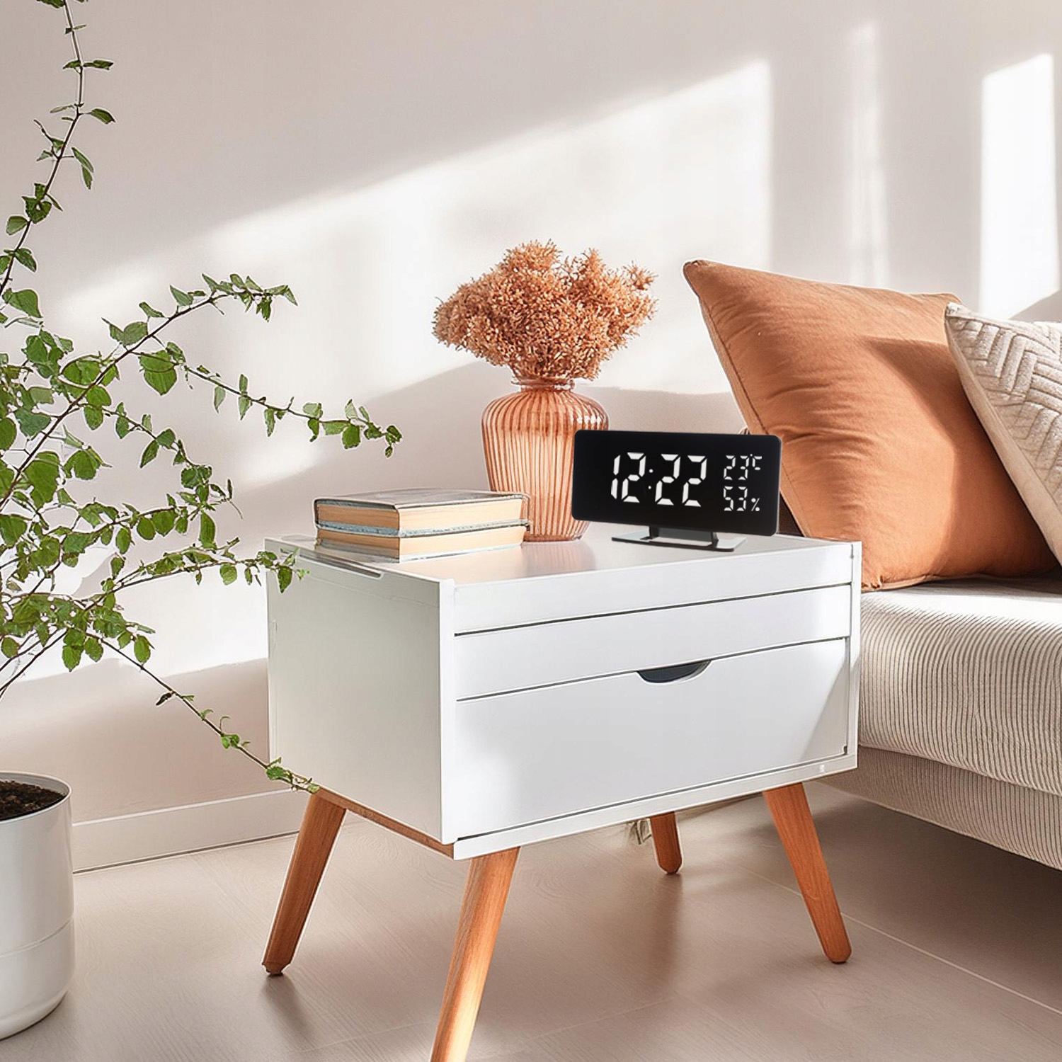 GreenBlue GB395 - це сучасний прилад з функцією сигналізації, термометра та гігрометра. Годинник оснащений великим читабельним екраном, який ідеально впишеться в будь-який інтер'єр, незалежно від того, оформлений він в класичному або сучасному стилі. Великі цифри забезпечують читабельність навіть із великої відстані, а вбудований датчик дозволяє відображати температуру та вологість навколишнього середовища.