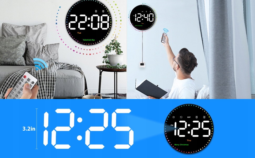 Зображення може містити: текст вище: «Перевіряйте час у будь-якій точці кімнати, цифровий настінний годинник має два режими відображення, один відображає лише час, інший — цикл час-дата-температура. Задовольняйте ваші потреби відстежувати час у будь-який час. Великий цифровий настінний годинник підходить для вітальні, кухні, гаража, офісу, складу, класу, спортзал, магазин, дитяча кімната.