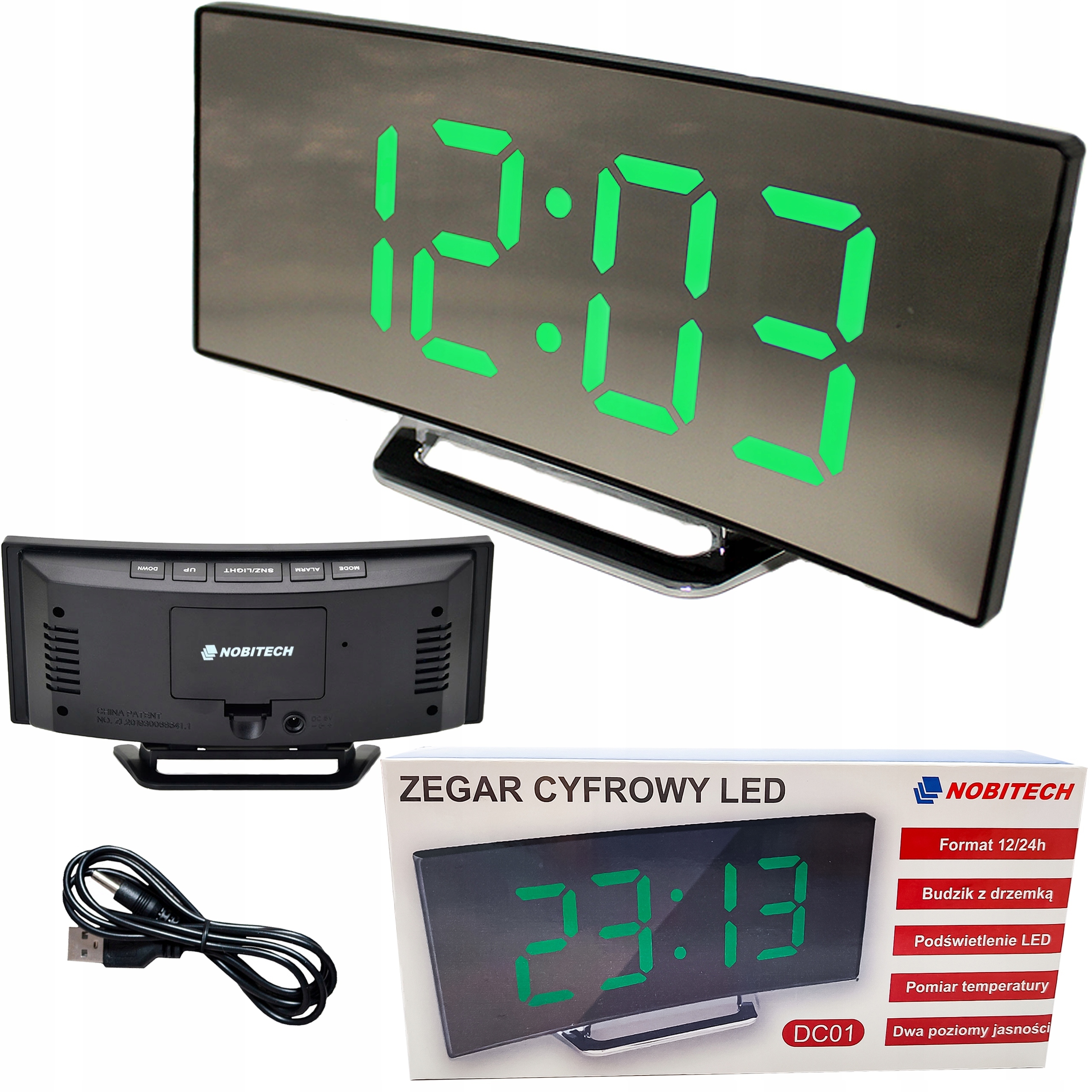 Час відображається на цифровому світлодіодному дисплеї в зелений. Ви можете вибрати 12-годинний або 24-годинний формат часу. Підсвічування годинника має два рівні яскравості. Годинник також має можливість відображати температуру навколишнього середовища в градусах Цельсія або Фаренгейта.