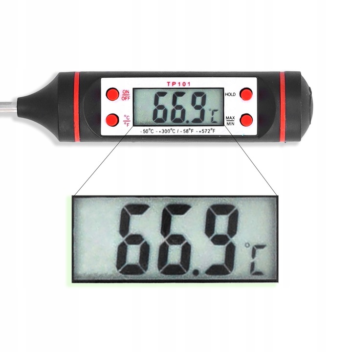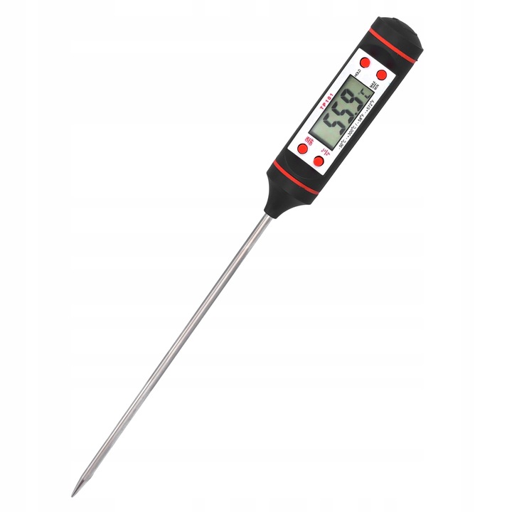 Термометр оснащений шпажкою, яка дозволяє швидко занурювати його в блюдо та зчитувати результат на чіткому РК-дисплеї. Завдяки цьому інструменту кожен кухар може легко контролювати та контролювати температуру, яка необхідна для збереження якості та смаку приготованих страв.