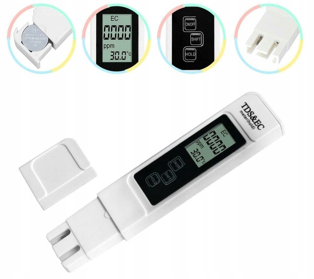 Лічильник твердості води. Цей тестер буде корисним у повсякденному житті при перевірці чистоти питної води та в інших застосуванні (наприклад, акваріум або лабораторні випробування). Пристрій дуже простий у використанні - просто вийміть кріплення, занурюйте електроди у випробувану воду. Вбудований РК -дисплей дозволяє точне та розбірливе вимірювання твердості води (його забруднення неорганічними сполуками) та його температурою. Це не вимагає зовнішніх джерел живлення (електрична мережа), але лише один акумулятор CR2032, що робить його надзвичайно мобільним та безпечним в контакті з водою. Лічильник масштабується у значеннях "PPM" - частин на мільйон, що є найпопулярнішим методом визначення кількості хімічних молекул, розчинених у воді у воді. Чим менше забруднена вода, тим нижча її електропровідність. Сирома, нерафінована вода може показати результат до 200 проміжок або вище. Загально використовувана одиниця провідності води-μs/cm (= мікро-симени/см). Солодка вода або вода в ставку повинна мати провідність між 300 і 1200 мкс/см. Ви можете негайно перевірити, чи підходить вода для пиття та інших додатків. Функція утримування вимірюваного результату та зсуву змінюють фонд TDS/EC
