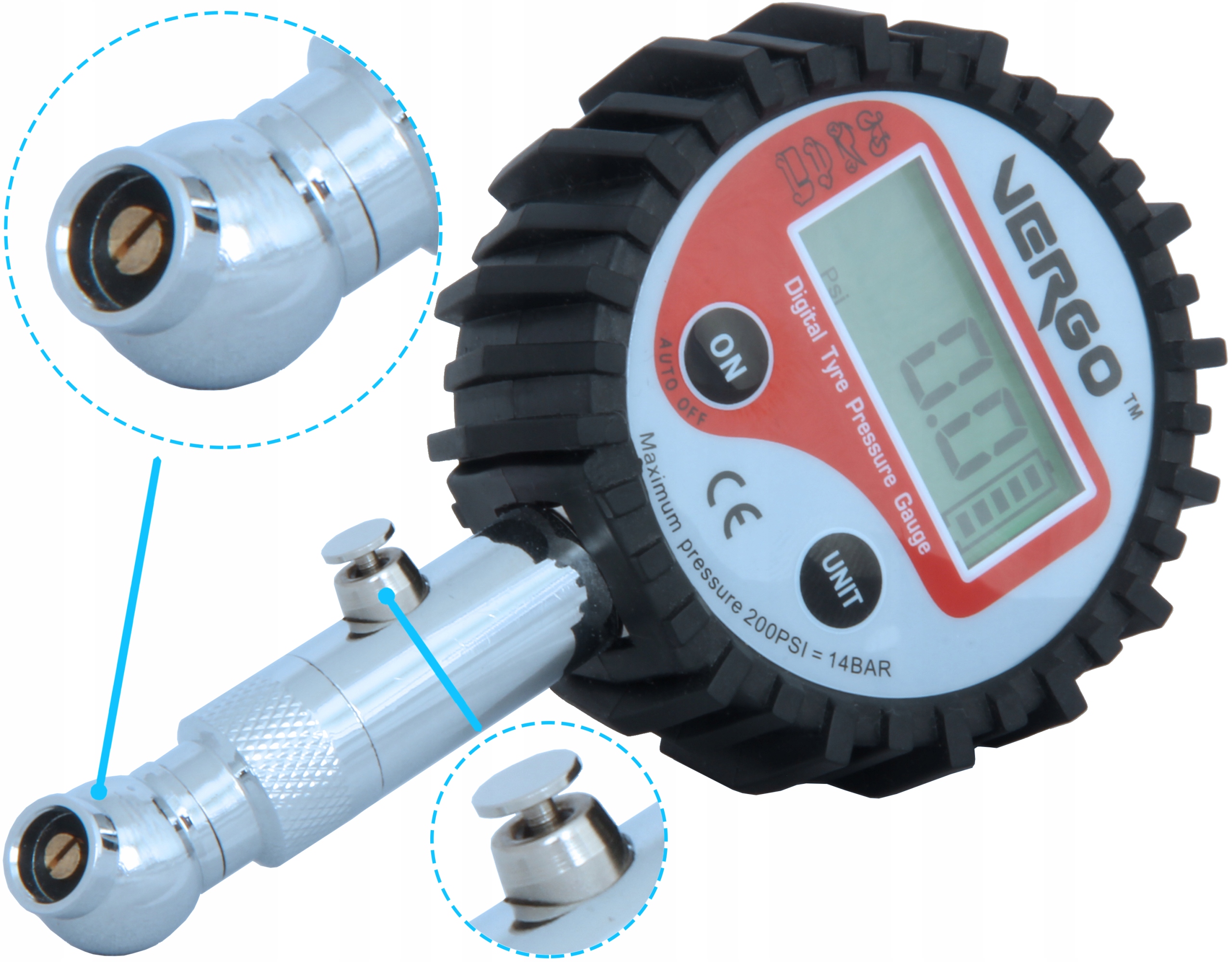 - Діапазон вимірювання 0–200 psi, 0–1380 кПа, 0–13,8 бар і 0–14,06 кг/см2