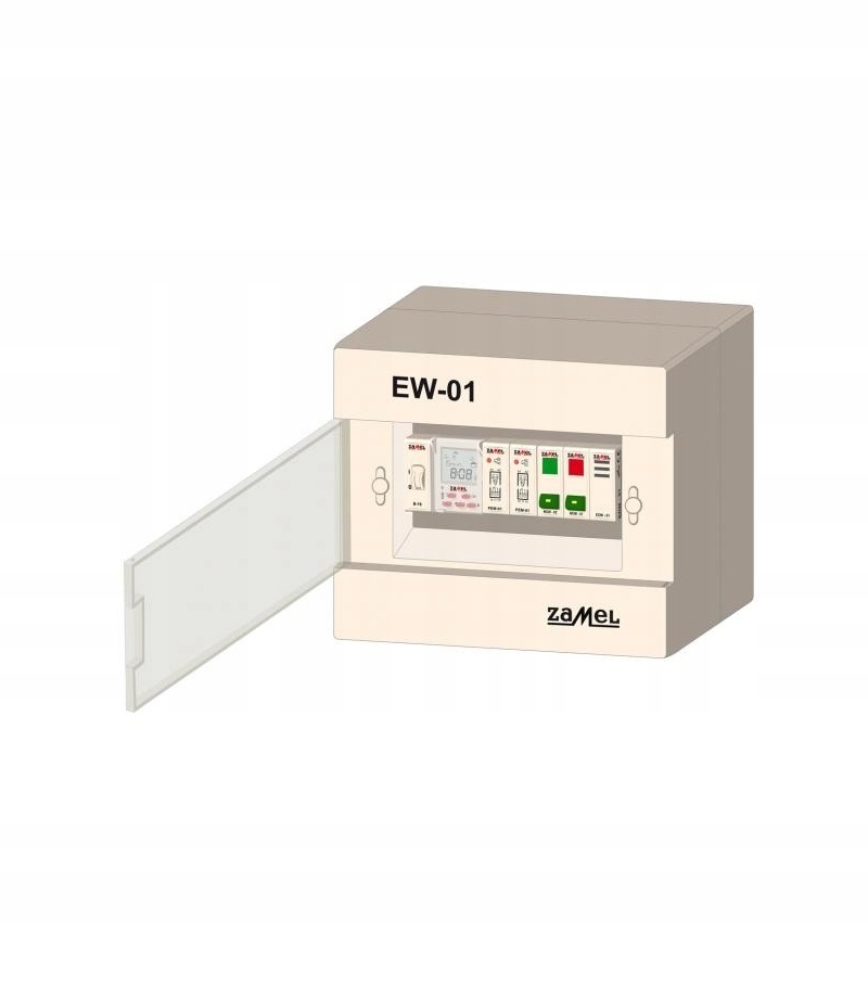 Опис. Набір призначений для модернізації або будівництва нової дзвонової установки. Комплект EW-01 оснащений роз'єднувачем, контролером дзвінка, паралельними реле і спеціальними кнопками управління, що дозволяють активувати режим скороченого уроку, і кнопкою тривоги зі звуковою сигналізацією. Основним елементом управління є контролер шкільного дзвінка СДМ-10, призначений для управління звуковою сигналізацією в школах з використанням дзвінка (наприклад, ДНТ-212, ДНС-212, ДНТ-212М, ДНС-212М - виробник Замель). Управління автоматичне за заданим алгоритмом. Програма складається із зазначенням часу уроку, тривалості наступних перерв і часу початку. Пристрій готовий для активації спеціальних функцій (дзвінки, скорочені уроки) через програмовані входи управління. Примітка: пристрій працює з дзвінками з номінальною напругою живлення 230 В змінного струму. Можливе використання дзвінків 8, 24 В змінного струму через трансформатор дзвінка типу TRM-8 або TRM-24 серії exta.